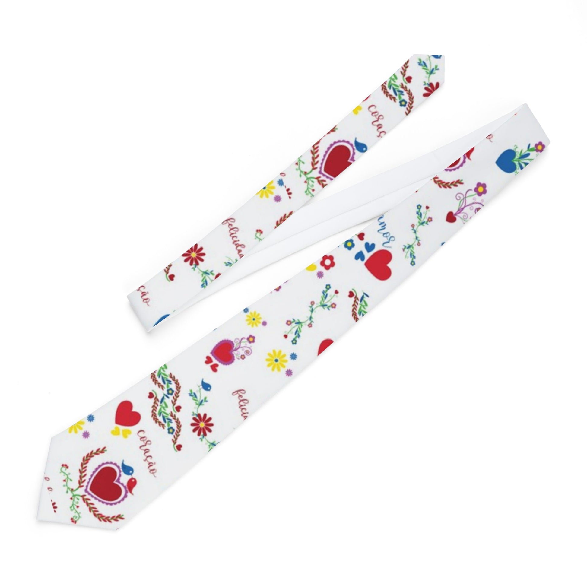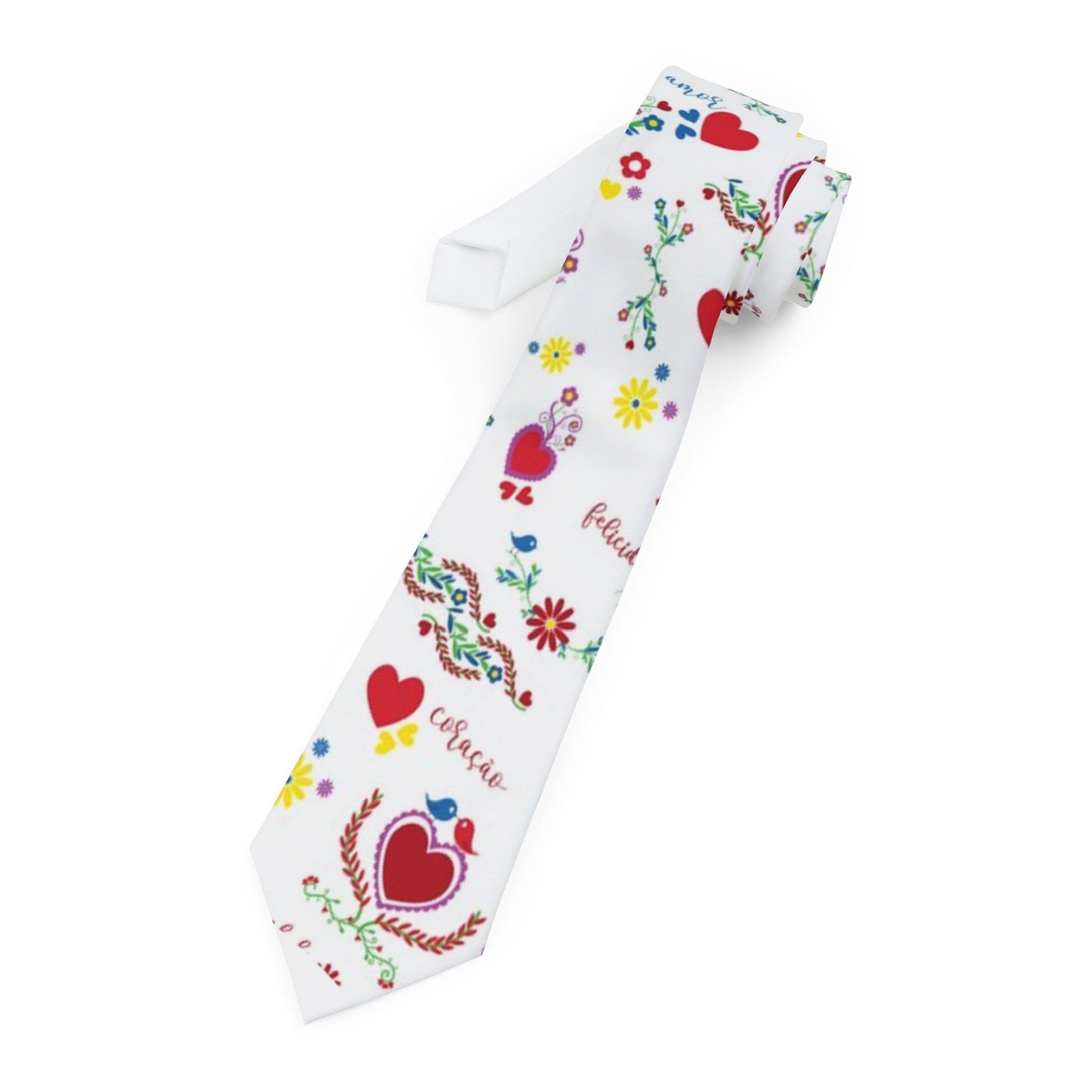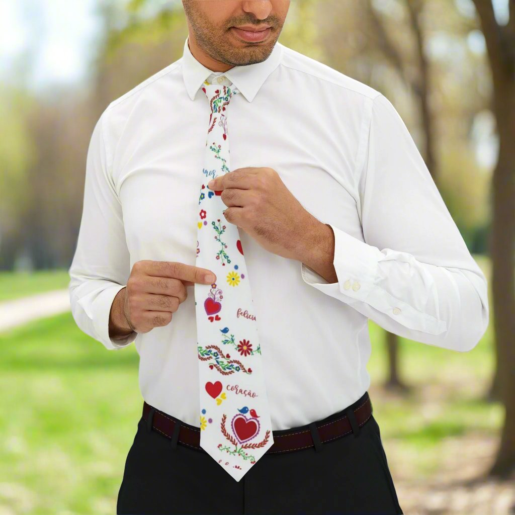 This charming necktie features a design inspired by the traditional Portuguese Lenço de Namorados, showcasing delicate embroidered hearts, flowers, and romantic motifs, adding a touch of cultural elegance to any outfit.