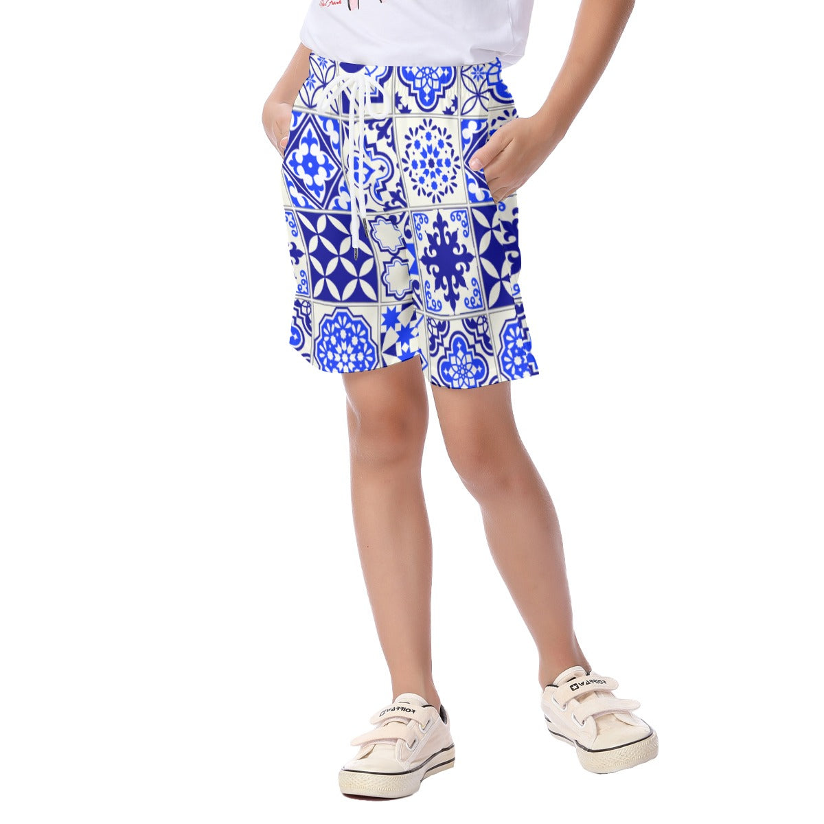 Introduce your child to stylish comfort with our Kids Swim Shorts featuring a striking Portuguese blue azulejo tile print. Compact with side pockets, they provide perfect storage for your child's beach treasures. The elastic waistband with a drawstring closure ensures a secure and adjustable fit, offering long-lasting comfortability for all-day fun. Made from high-quality, quick-drying fabric, these swim shorts are perfect for both swimming and playing. Let your child enjoy the blend of cultural elegance and practical design with these unique and versatile swim shorts, making every beach adventure a stylish affair.