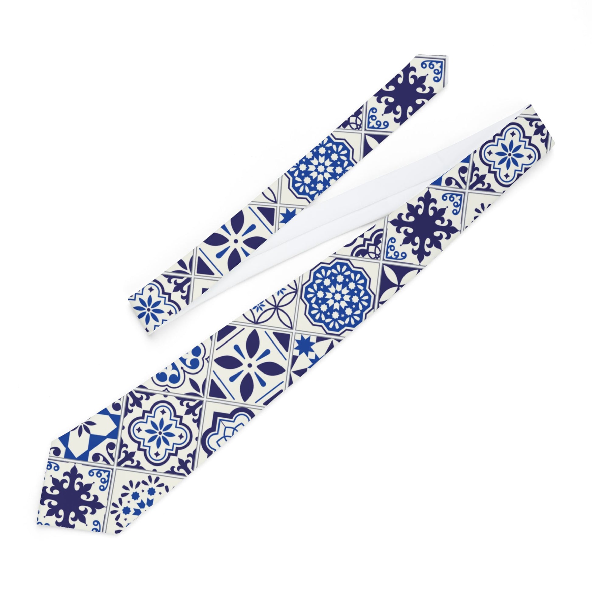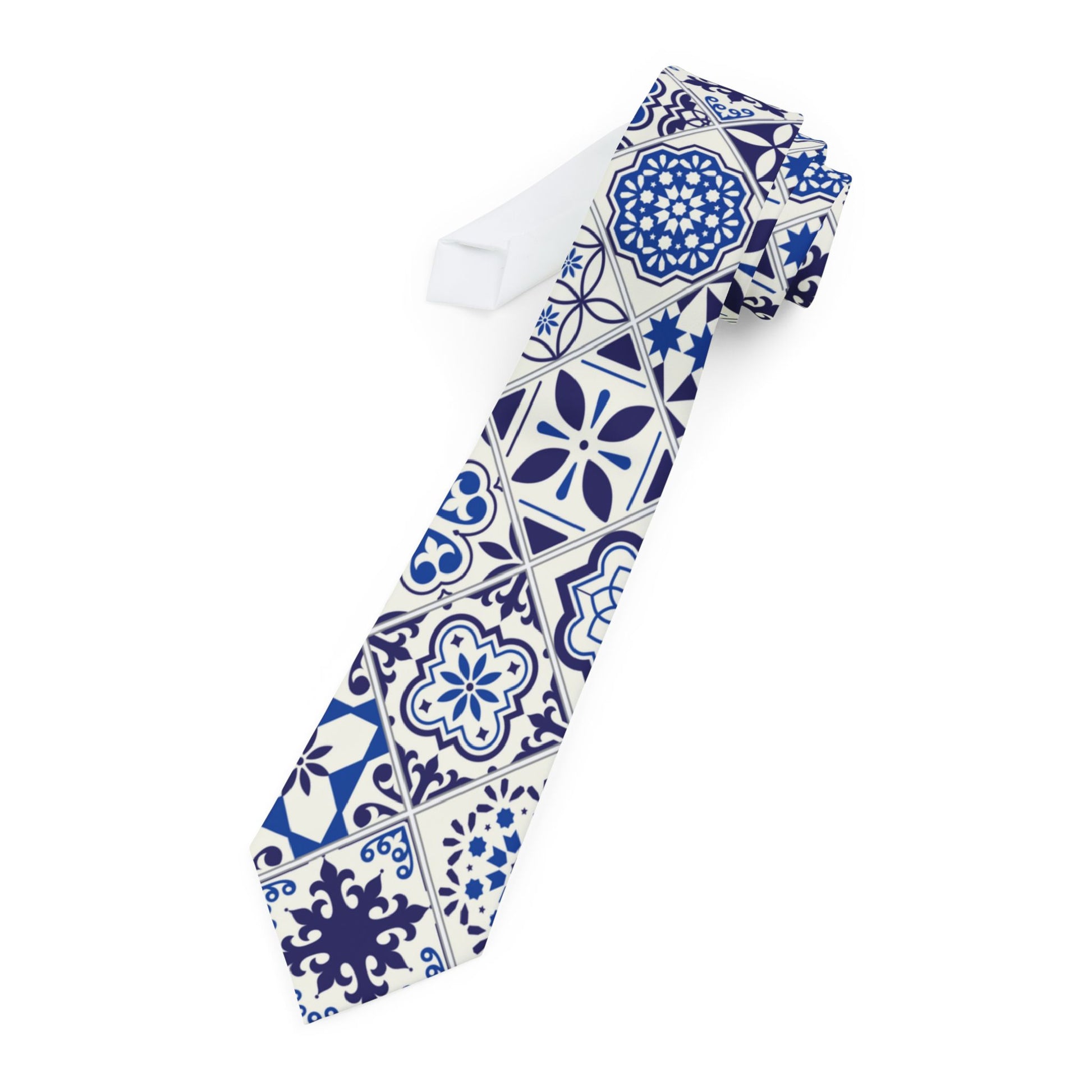 This elegant necktie features a Portuguese-inspired design, showcasing intricate azulejo tile patterns in vibrant blue and white. A timeless accessory that adds a touch of heritage and sophistication to any outfit.