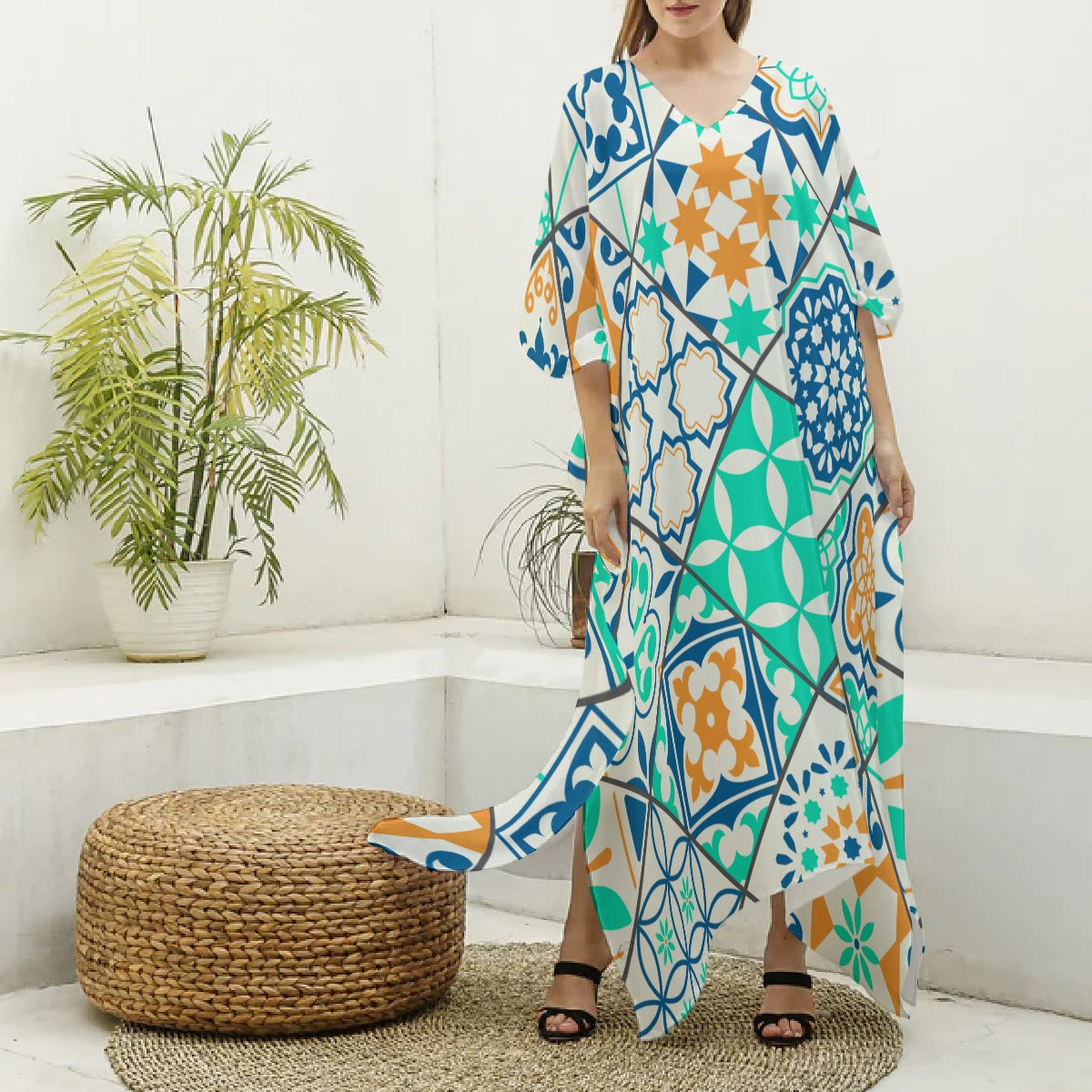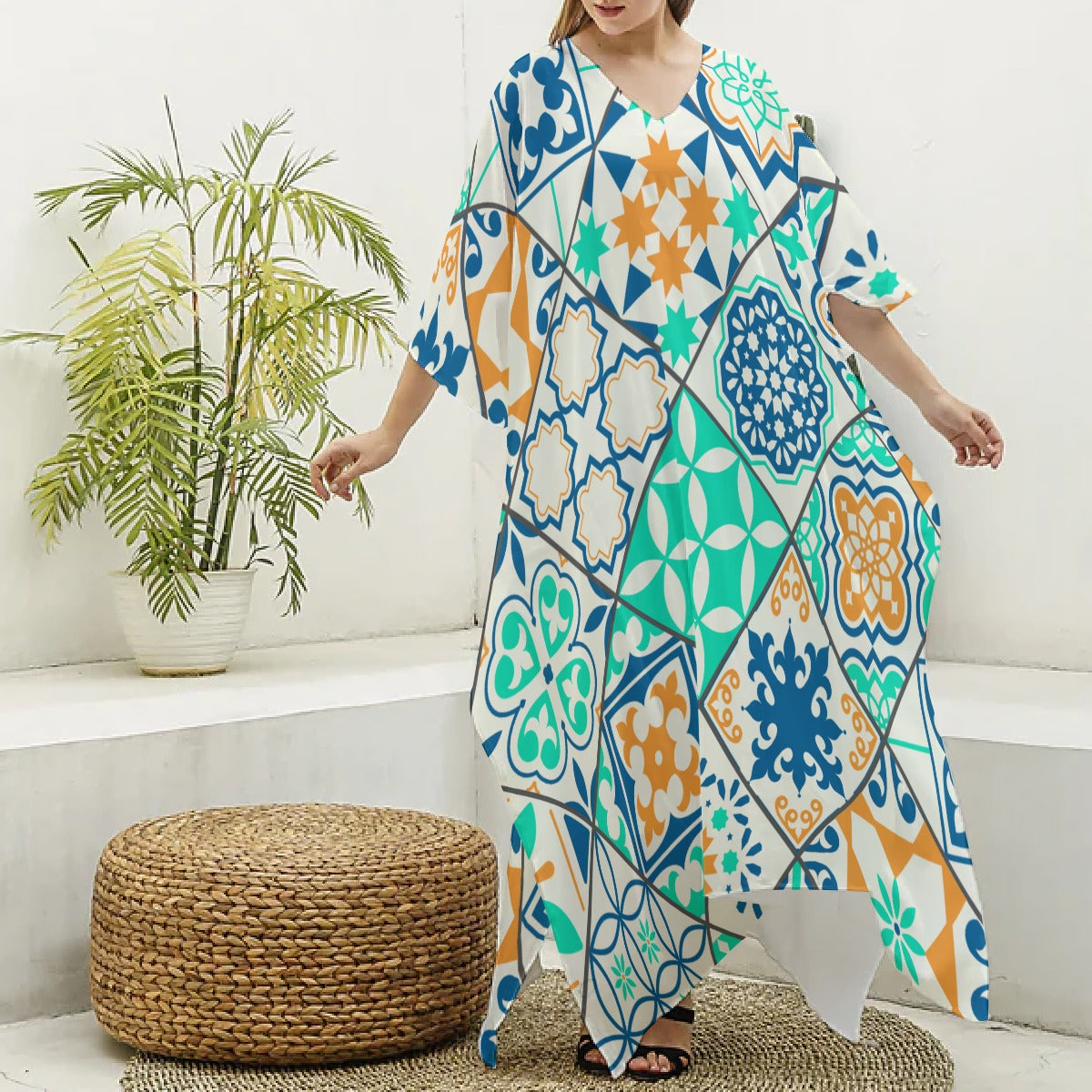 Apresentamos o nosso vestido kaftan feminino com um deslumbrante padrão grande de azulejos portugueses verdes, azuis e amarelos! Perfeito para dias de verão e escapadelas de praia, este vestido combina elegância e conforto sem esforço. Feito de tecido leve e respirável, ele cai lindamente e mantém você fresco. A silhueta solta e fluida favorece todos os tipos de corpo, enquanto a estampa vibrante dos azulejos adiciona um toque de sofisticação e diversão. Com decote em V e mangas largas, este kaftan exala estilo sem esforço. Fácil de usar e cuidar, é ideal para passeios casuais ou férias. Eleve o seu guarda-roupa com este atraente vestido kaftan com estampa de azulejos!