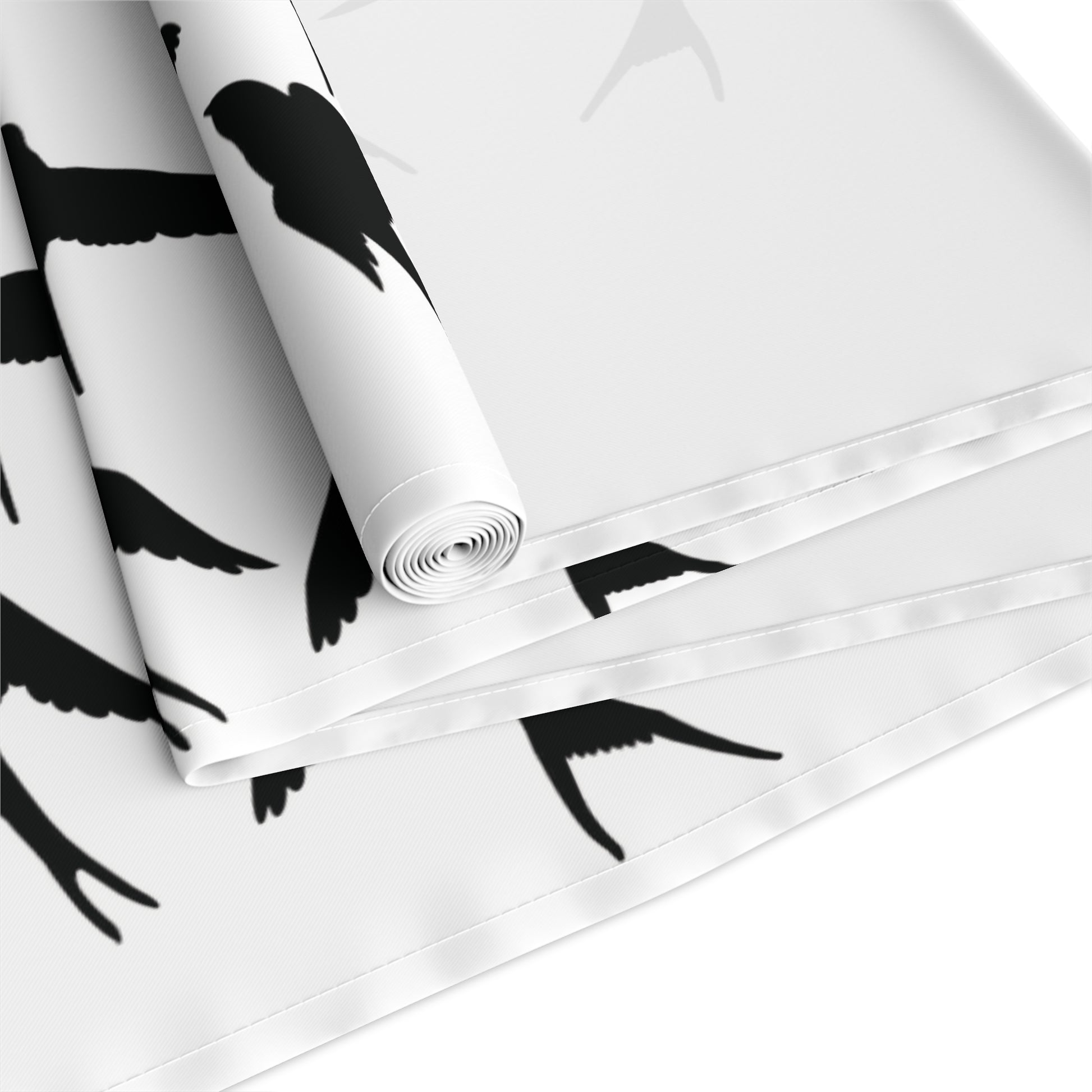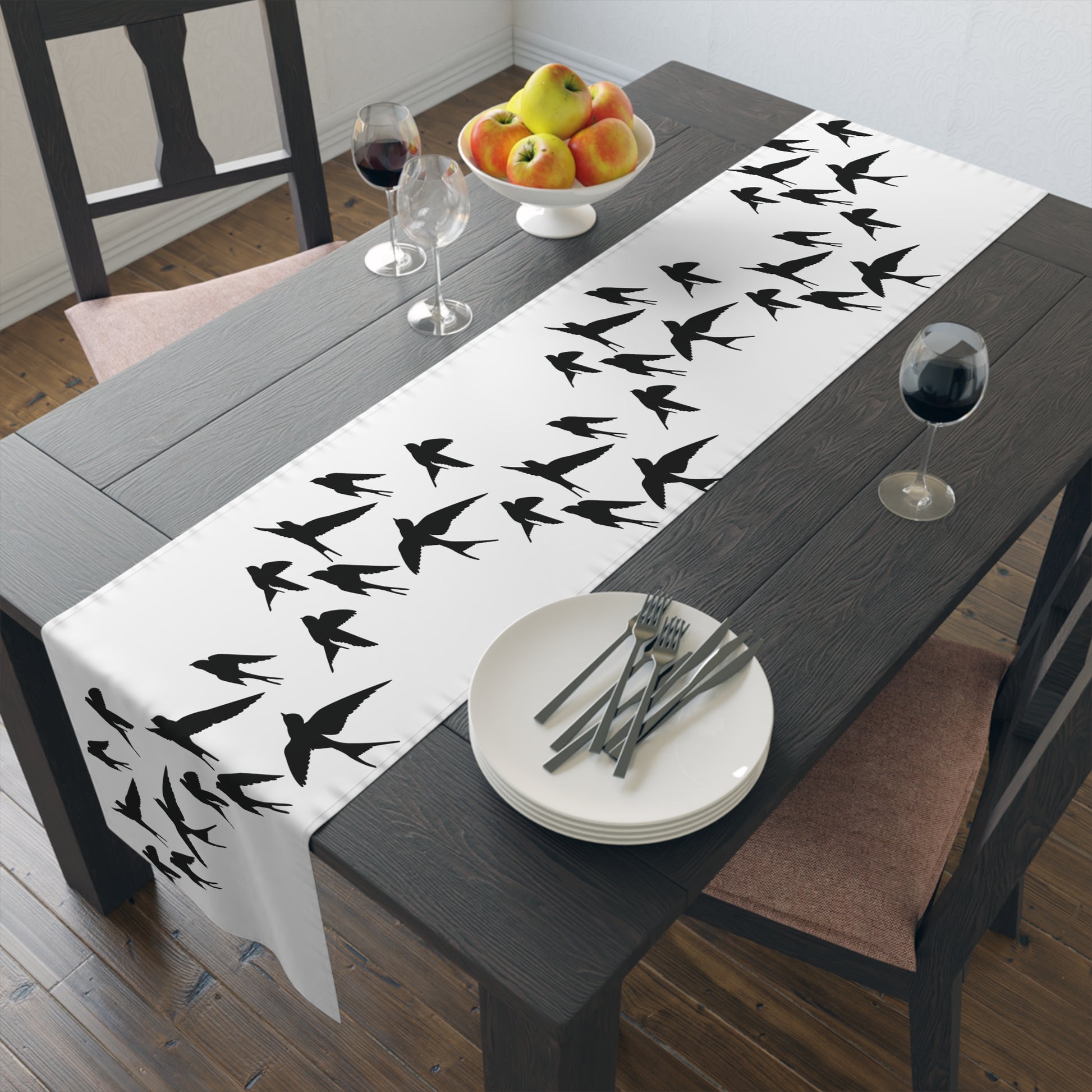 This elegant table runner features a sleek design of black andorinhas (swallows) in flight on a white background. It adds a modern, minimalist touch to your dining space, perfect for any occasion. Perfect for adding a modern yet timeless touch to any table setting, this table runner is ideal for both casual and formal occasions, making every meal a stylish experience.