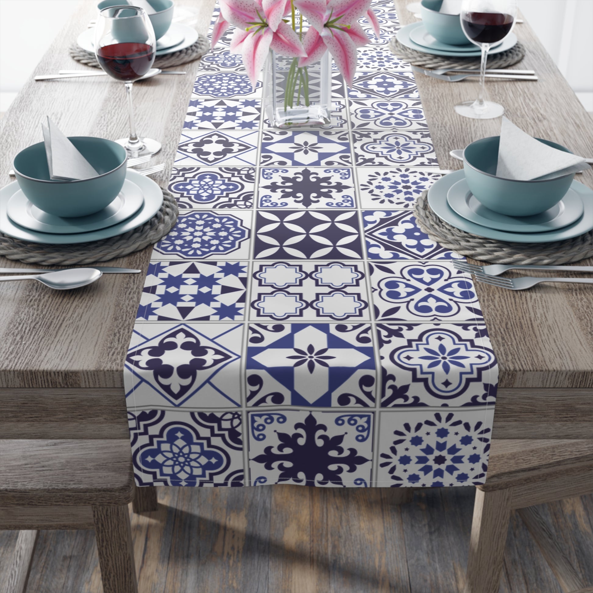 Transform your dining space with the refined charm of our Azul Table Runner, featuring a stunning grey and white Portuguese tile pattern. Inspired by traditional ceramic artistry, this elegant design brings a sophisticated, old-world aesthetic to your table while complementing both modern and classic interiors.