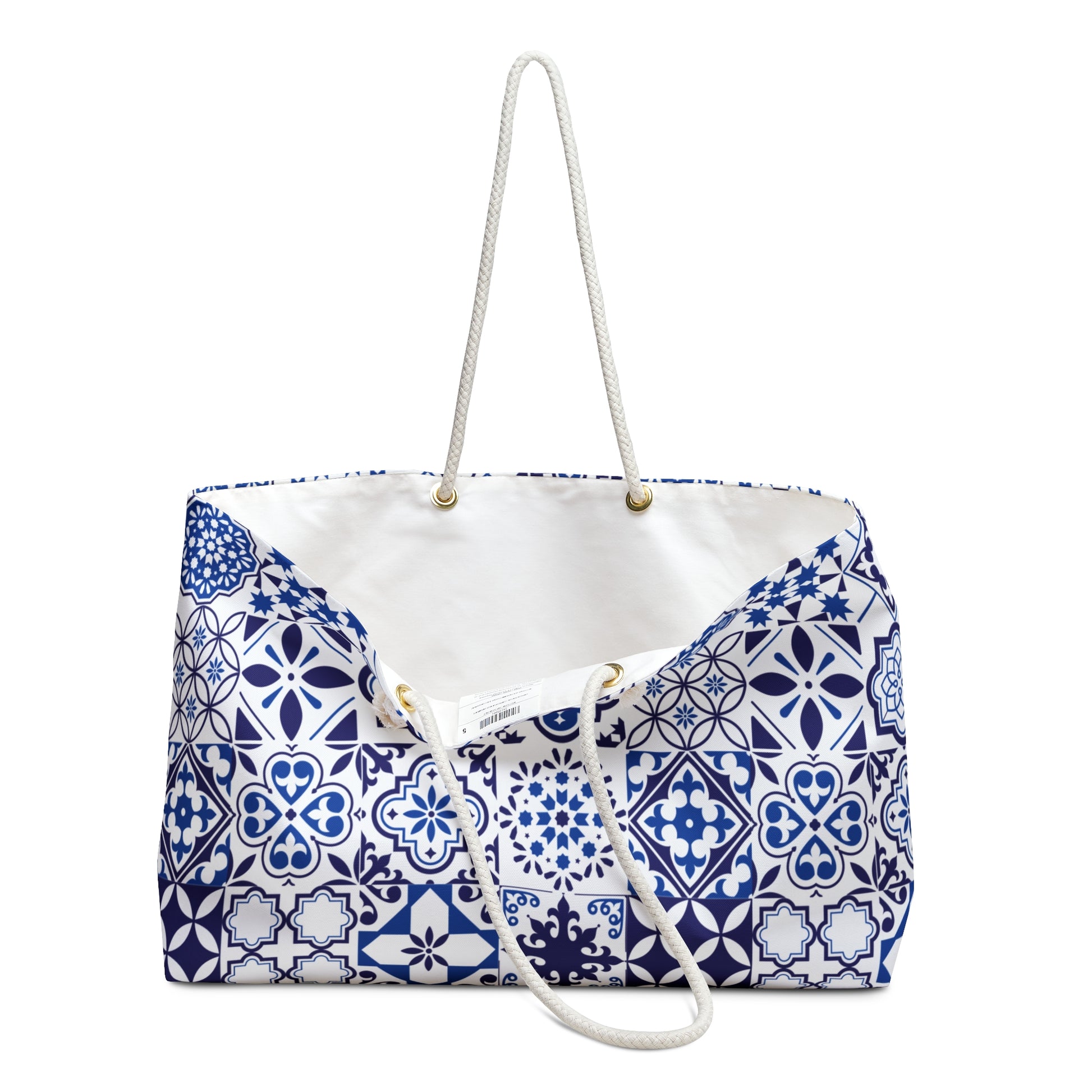 A nossa bolsa Weekender Tote de grandes dimensões, adornada com um deslumbrante padrão de azulejos azuis portugueses, é perfeita para o seu fim de semana na praia ou na cidade. A bolsa durável e de boca larga contém uma quantidade generosa de itens pessoais, facilitando a embalagem. Facilmente transportada pelas alças grossas de corda, esta bolsa elegante e funcional garante que você viaje com conforto e elegância. Esteja você indo para uma escapadela rápida ou para um dia relaxante na praia, o belo design dos azulejos adiciona um toque de charme cultural ao seu conjunto. Abrace a praticidade e a sofisticação com esta bolsa indispensável para o fim de semana. Feito nos Estados Unidos.