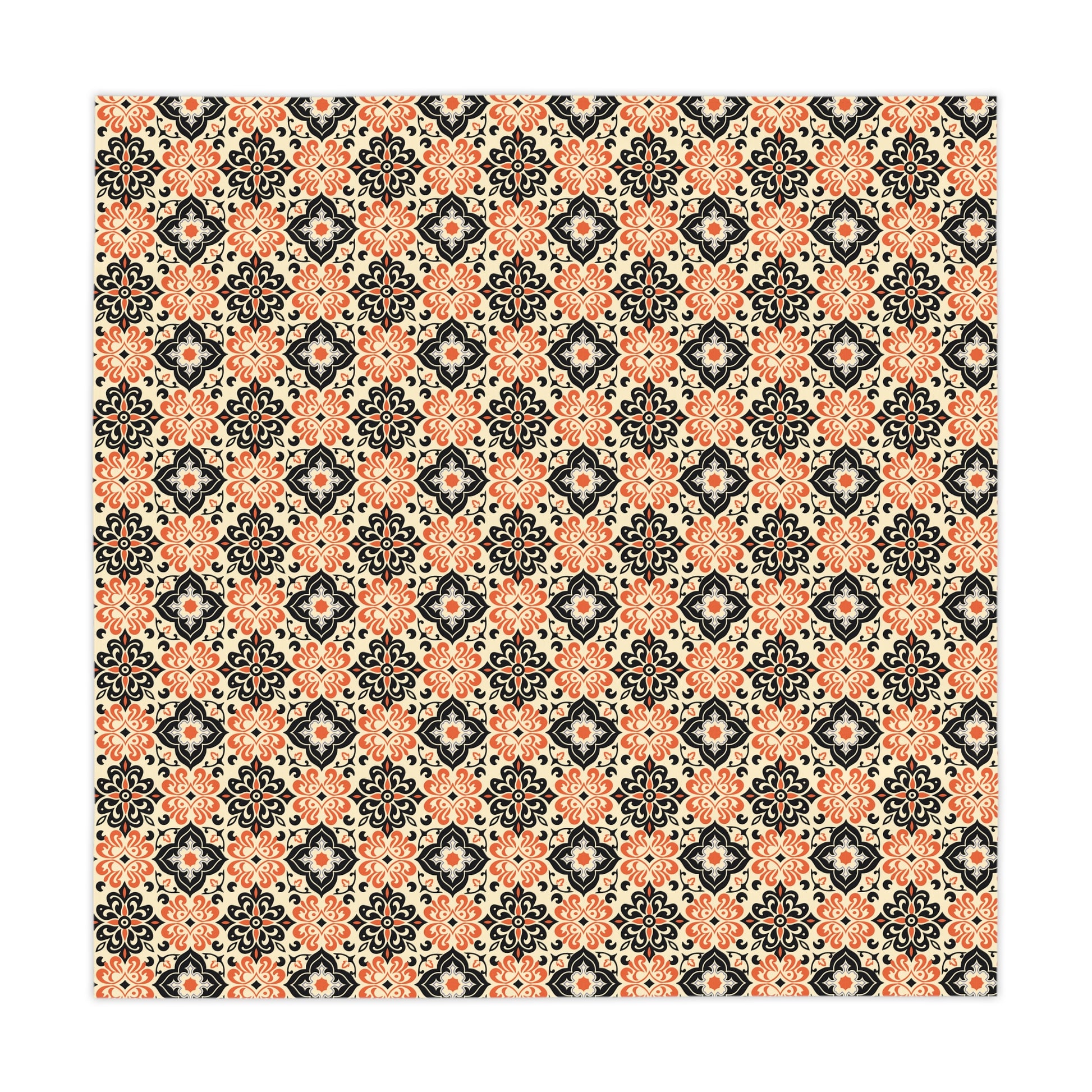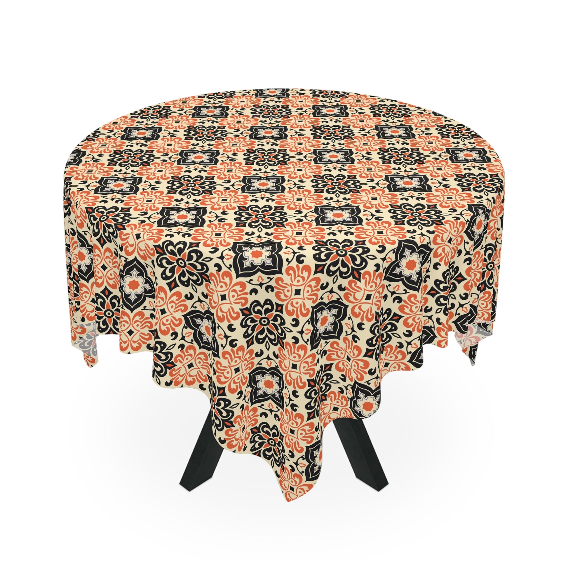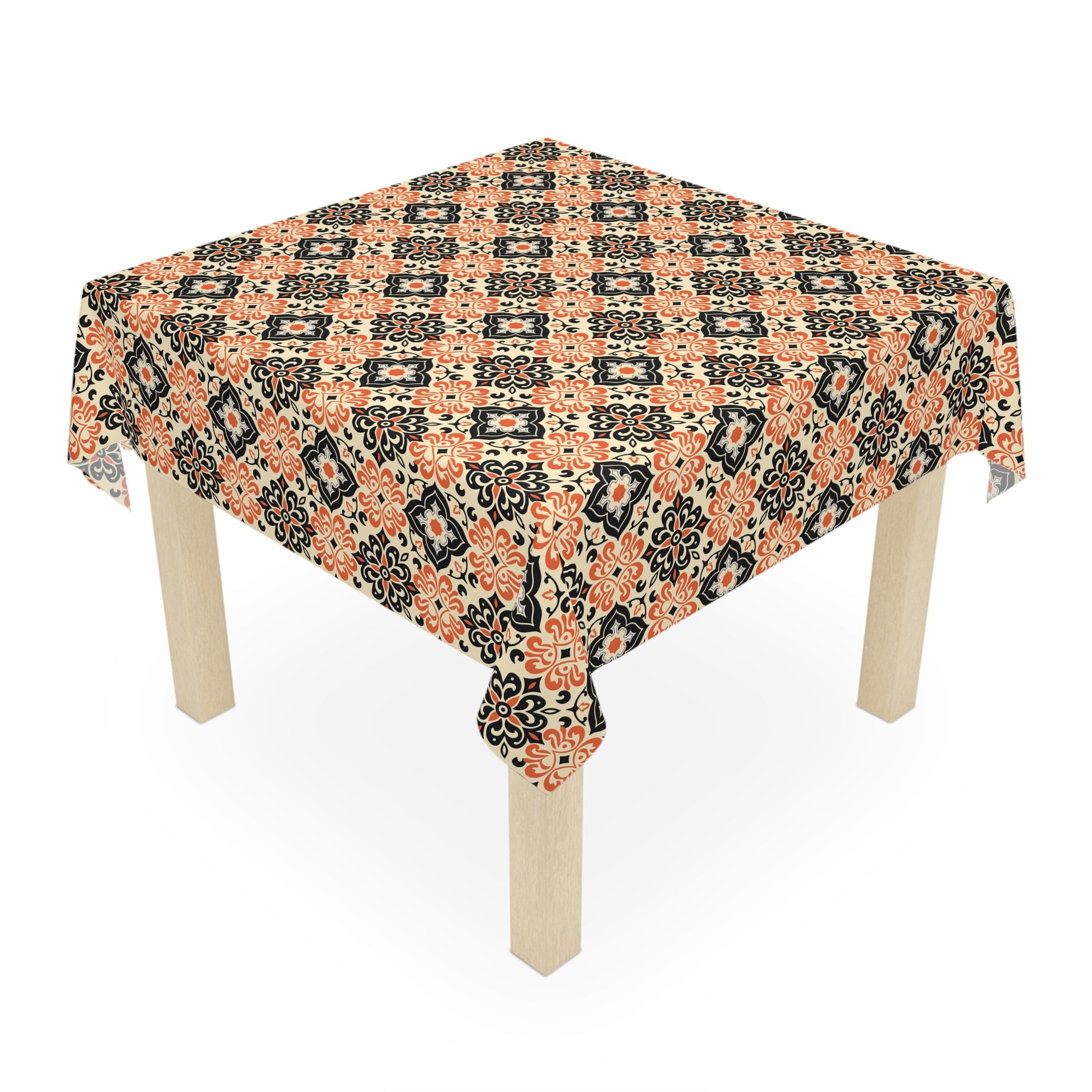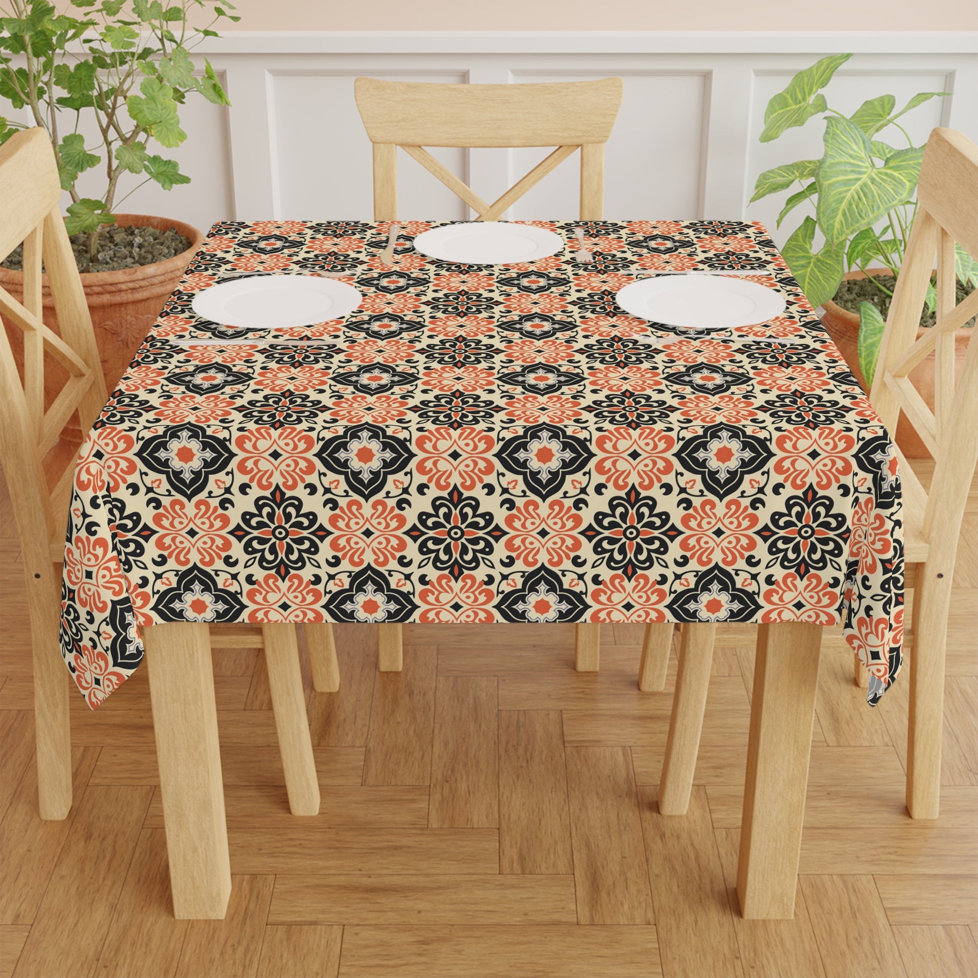 This tablecloth features a vibrant Portuguese tile-inspired pattern in black, orange, and cream, adding a stylish Mediterranean touch to your dining space. Perfect for enhancing both everyday meals and special occasions.
