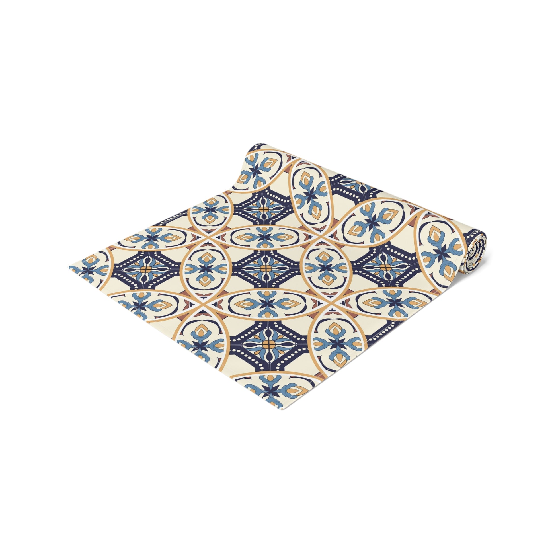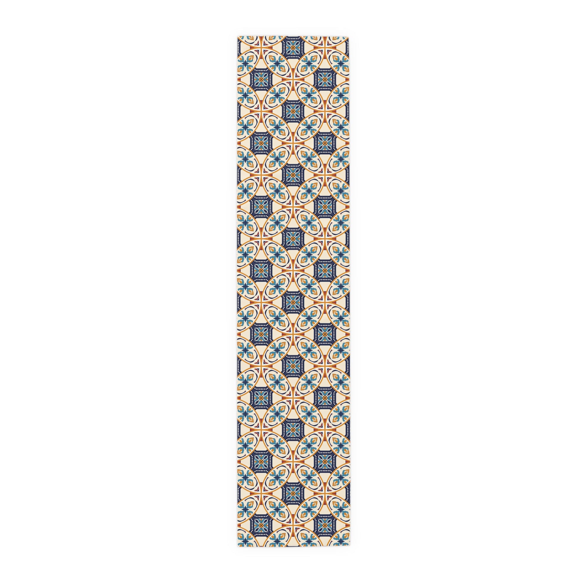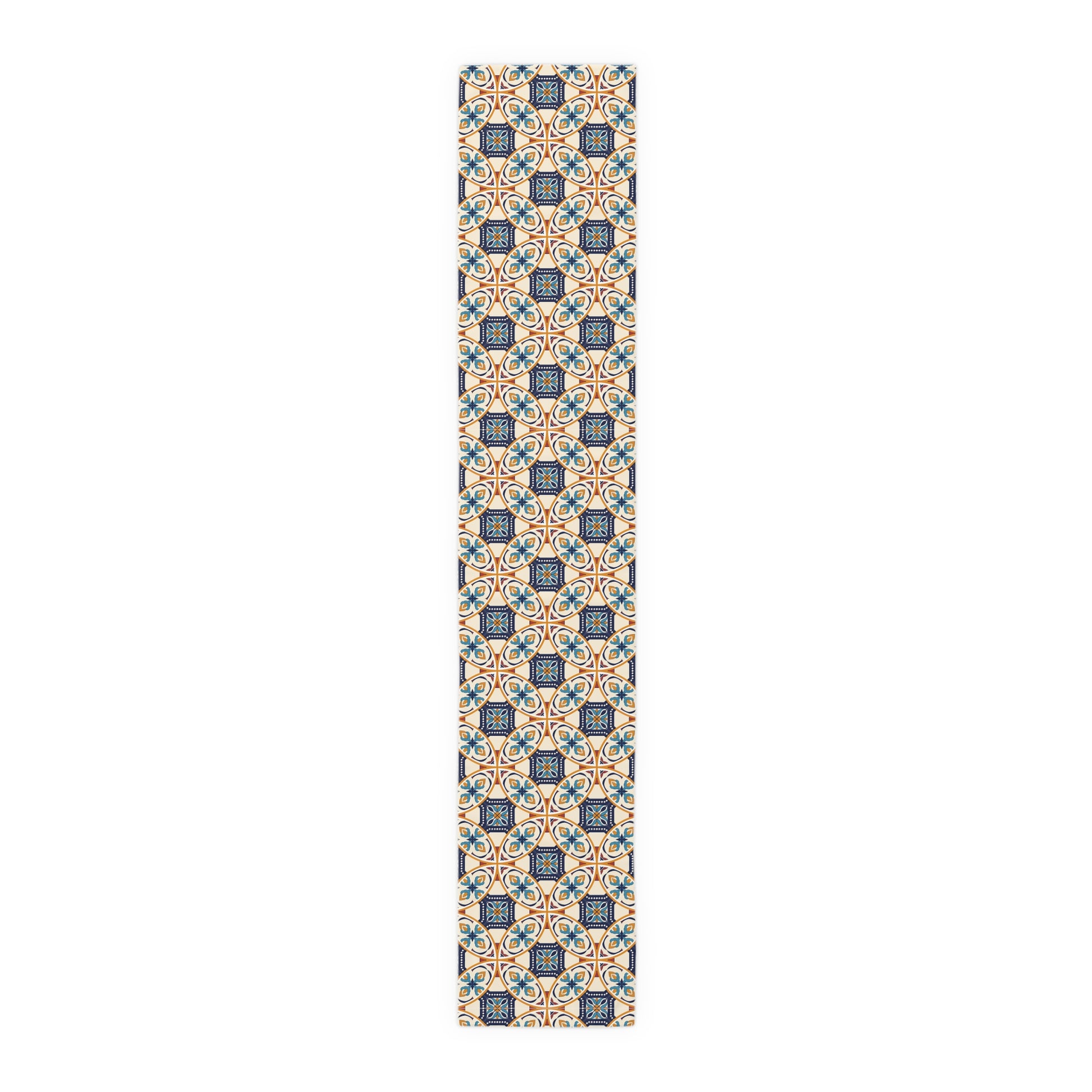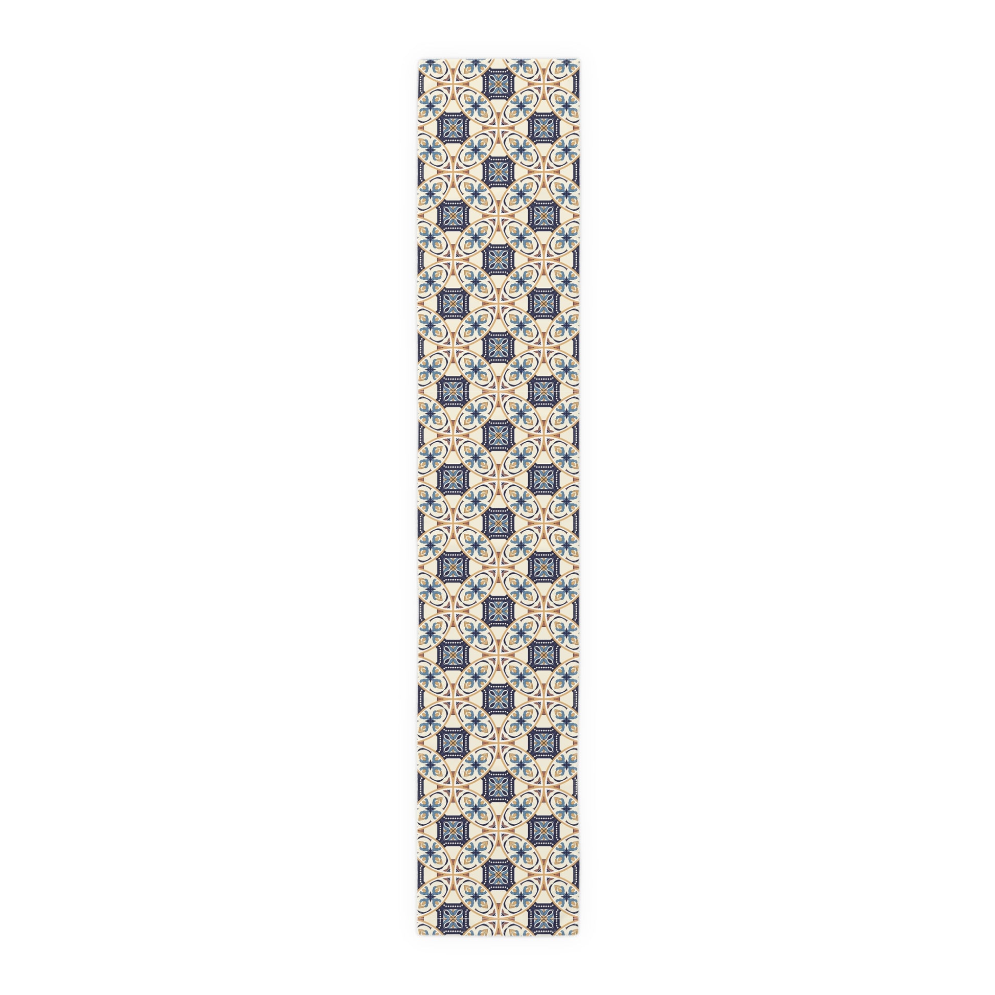 Elevate your dining experience with this exquisite table runner featuring a unique Portuguese tile pattern in shades of blue and beige. Perfect for adding a touch of elegance to any table setting, this runner is ideal for both casual and formal occasions. Its high-quality fabric ensures durability and easy maintenance, making it a stylish and practical addition to your home decor.