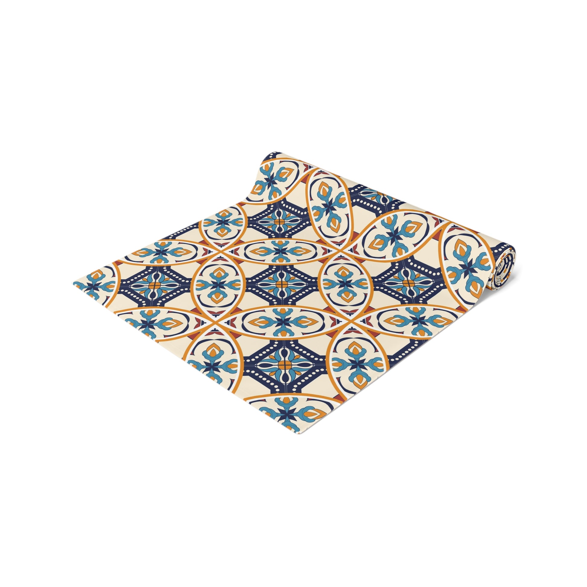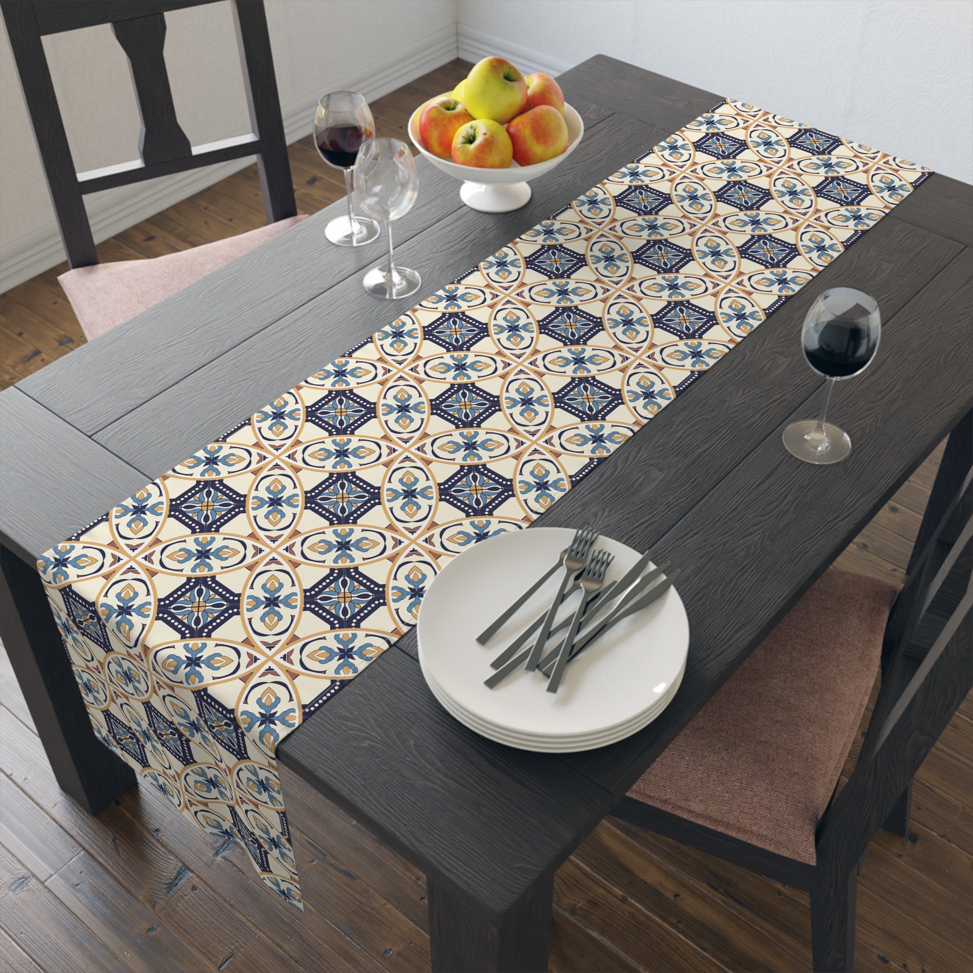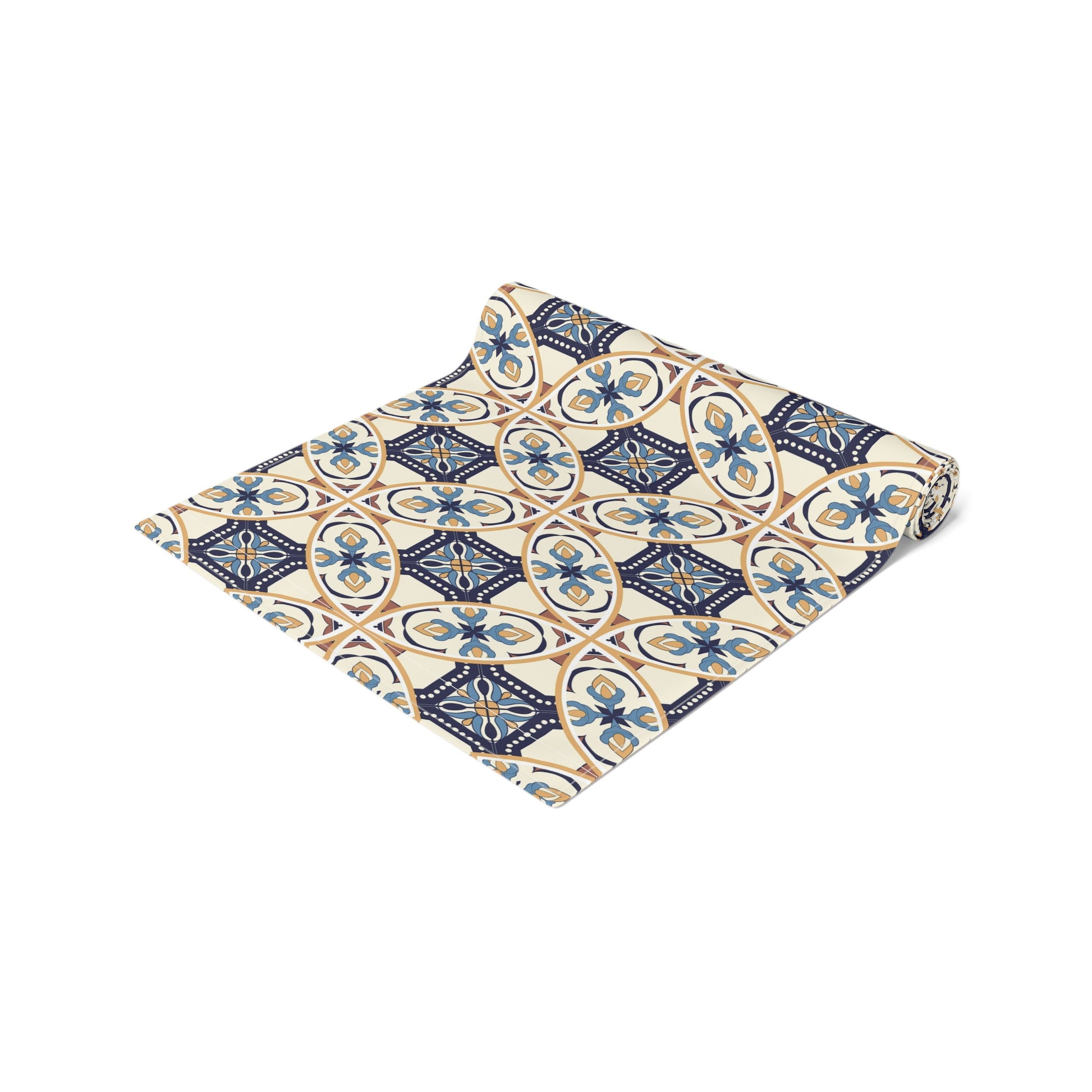 Elevate your dining experience with this exquisite table runner featuring a unique Portuguese tile pattern in shades of blue and beige. Perfect for adding a touch of elegance to any table setting, this runner is ideal for both casual and formal occasions. Its high-quality fabric ensures durability and easy maintenance, making it a stylish and practical addition to your home decor.