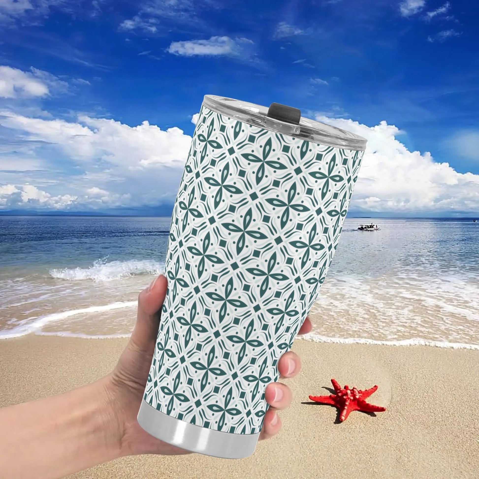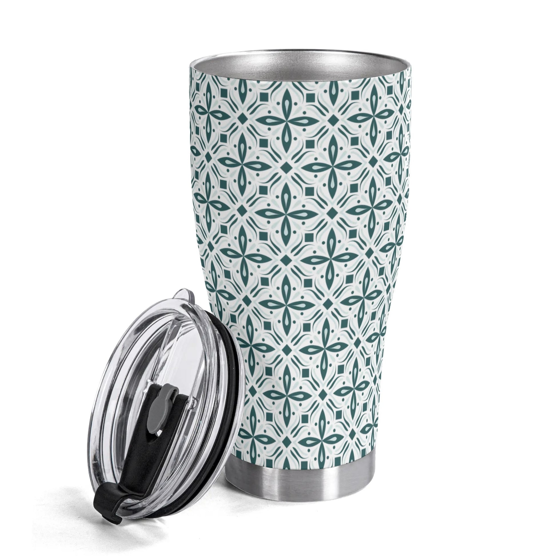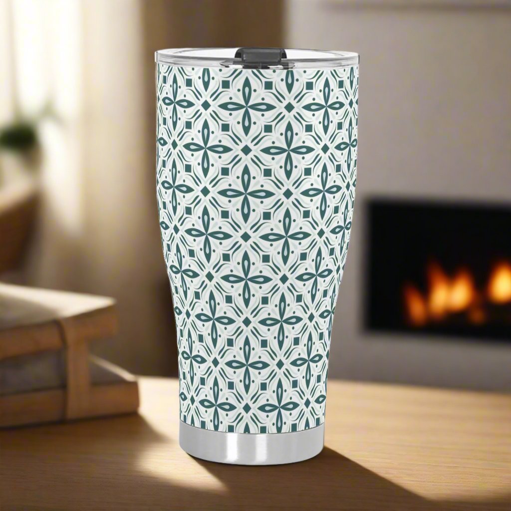 Introducing our stainless steel tumbler adorned with vibrant green and white scroll pattern. Perfect for hot and cold beverages, it features a secure lid and double-wall insulation for optimal temperature retention.