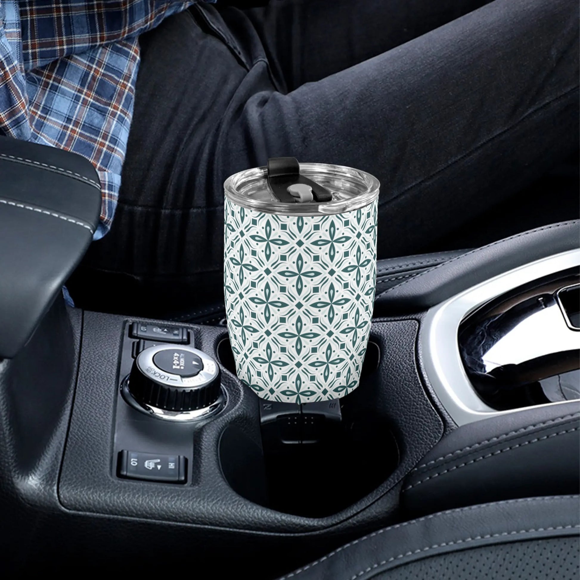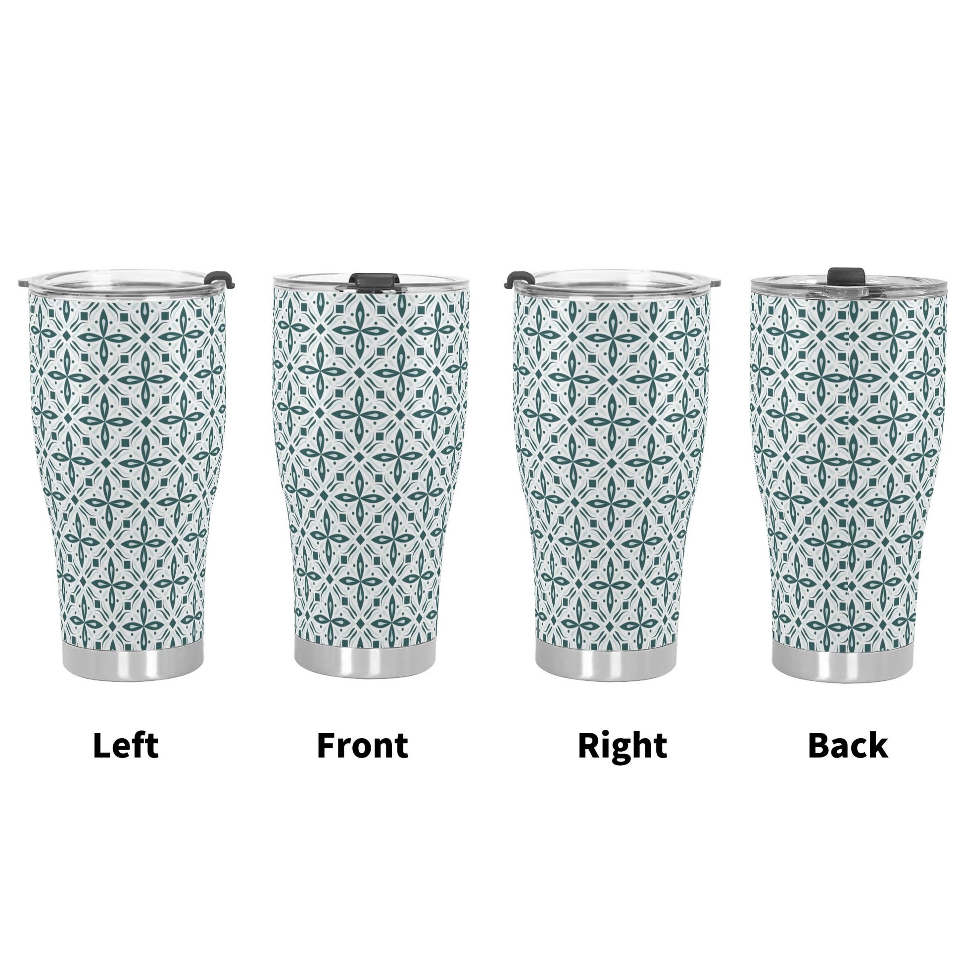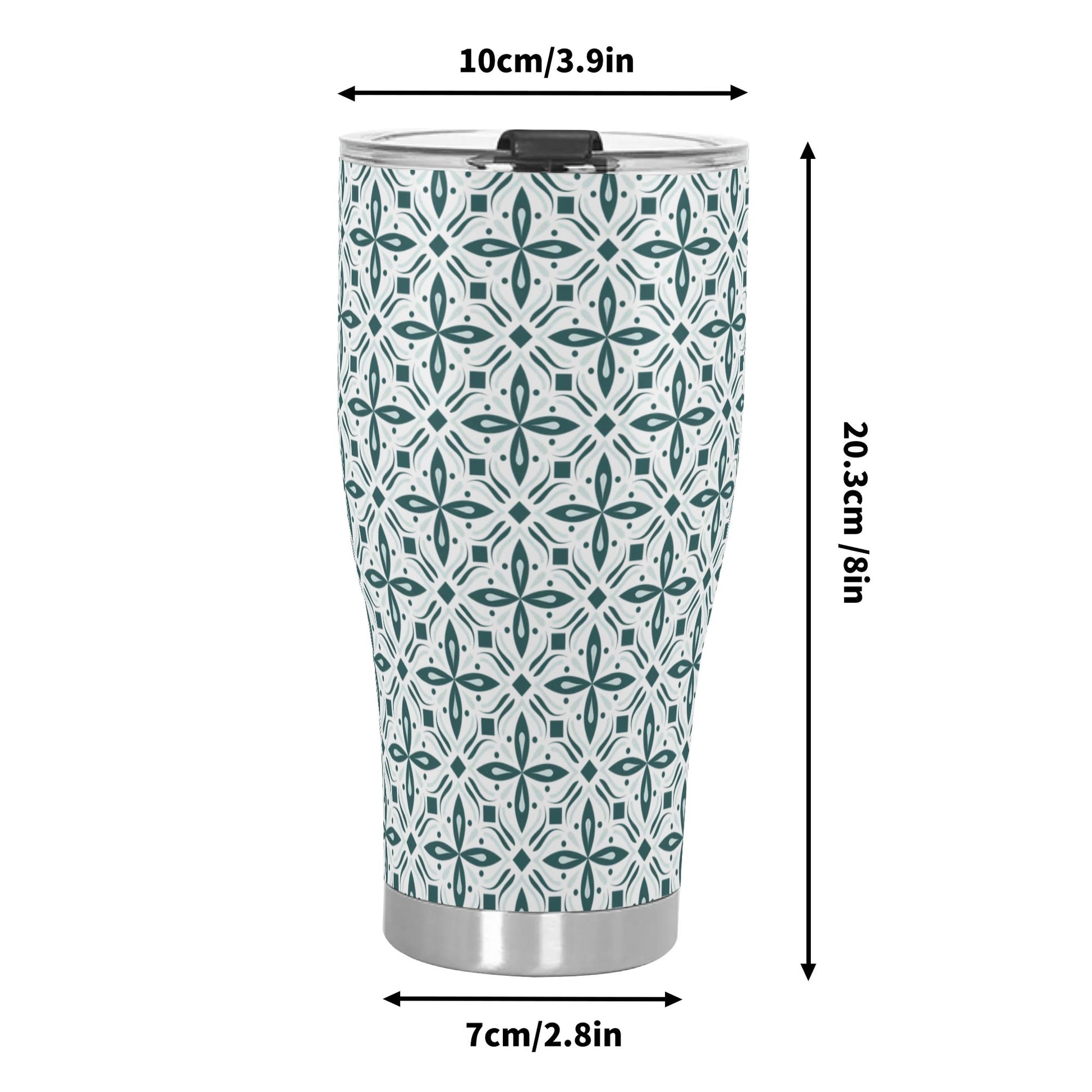 Introducing our stainless steel tumbler adorned with vibrant green and white scroll pattern. Perfect for hot and cold beverages, it features a secure lid and double-wall insulation for optimal temperature retention.