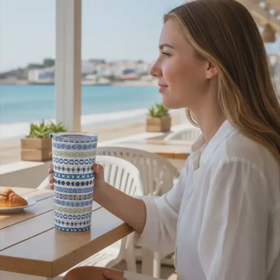 Turn your daily coffee run into a mini escape to Portugal with our 20oz Faixa Stainless Steel Tumbler. Wrapped in our signature Faixa pattern—bold, colorful bands inspired by traditional azulejo tilework—this glossy travel tumbler blends timeless European design with modern, on-the-go functionality.