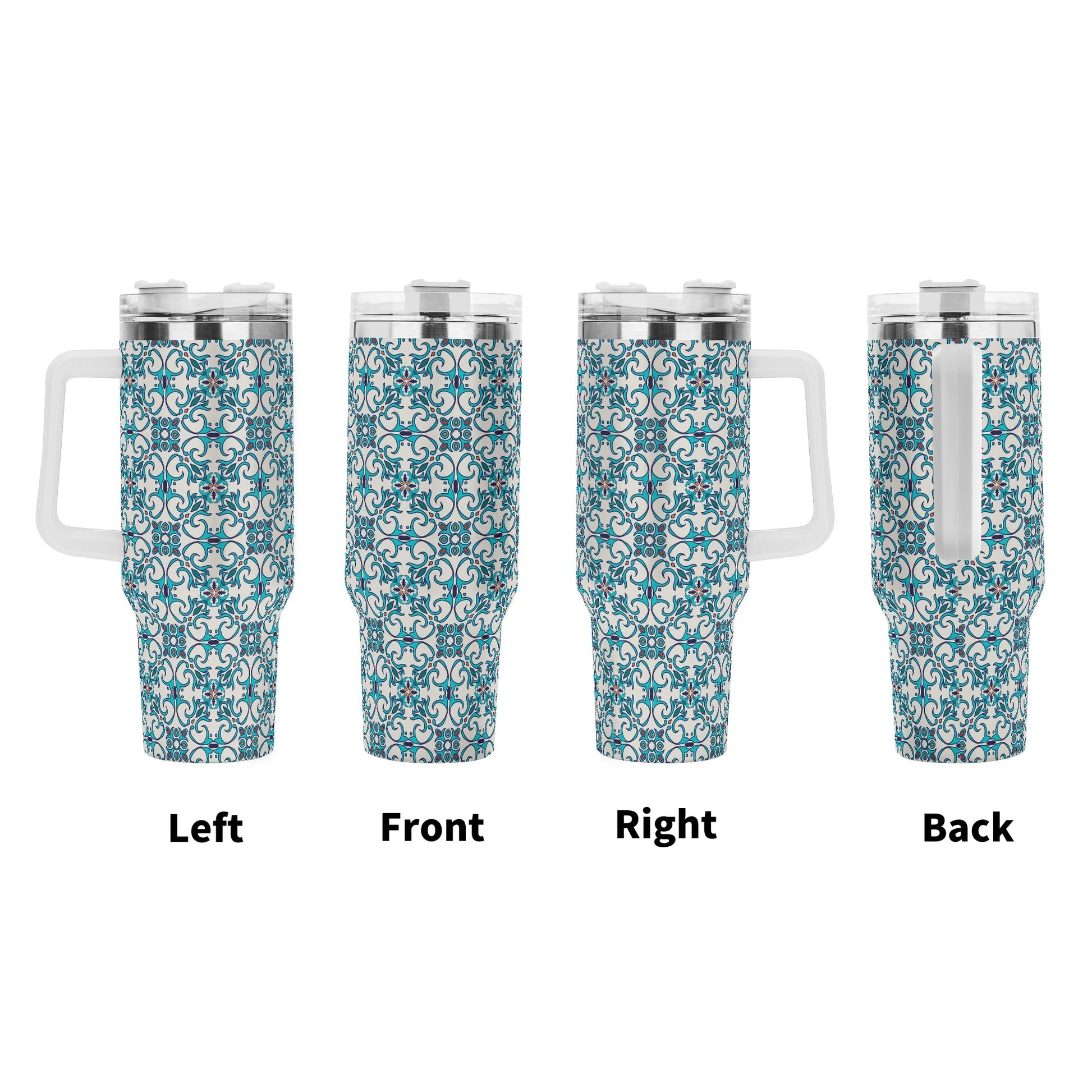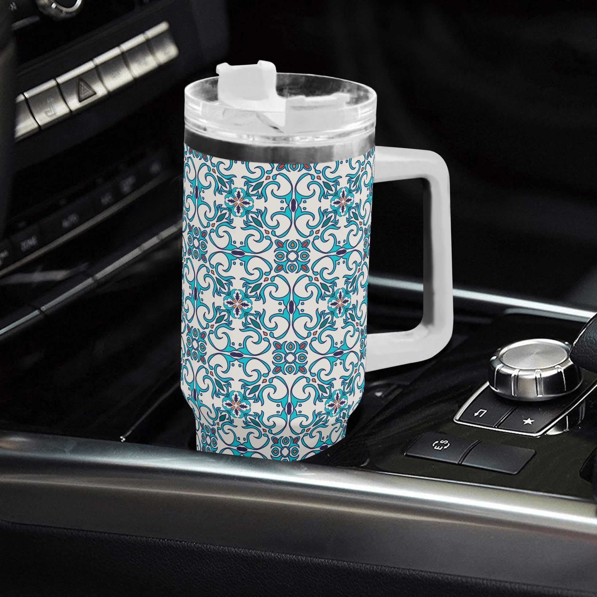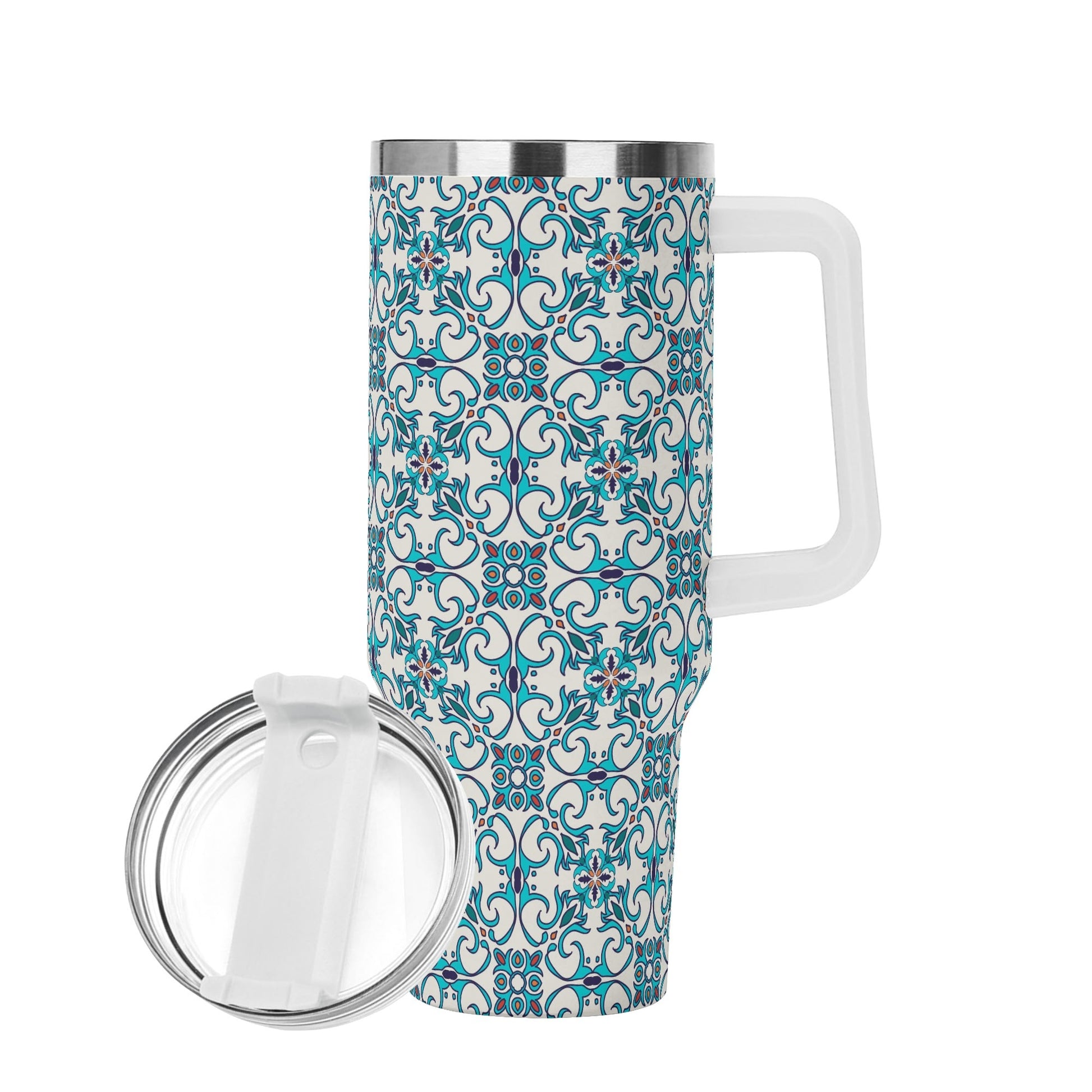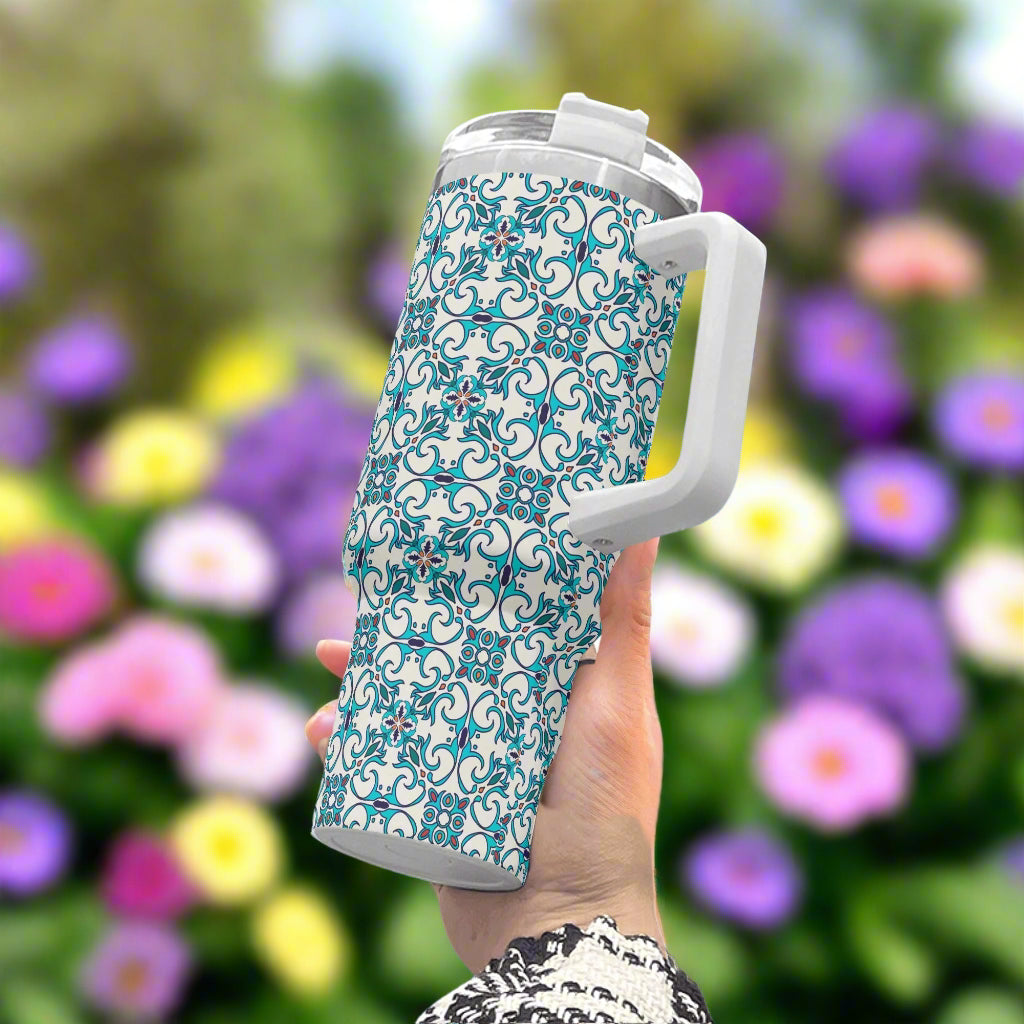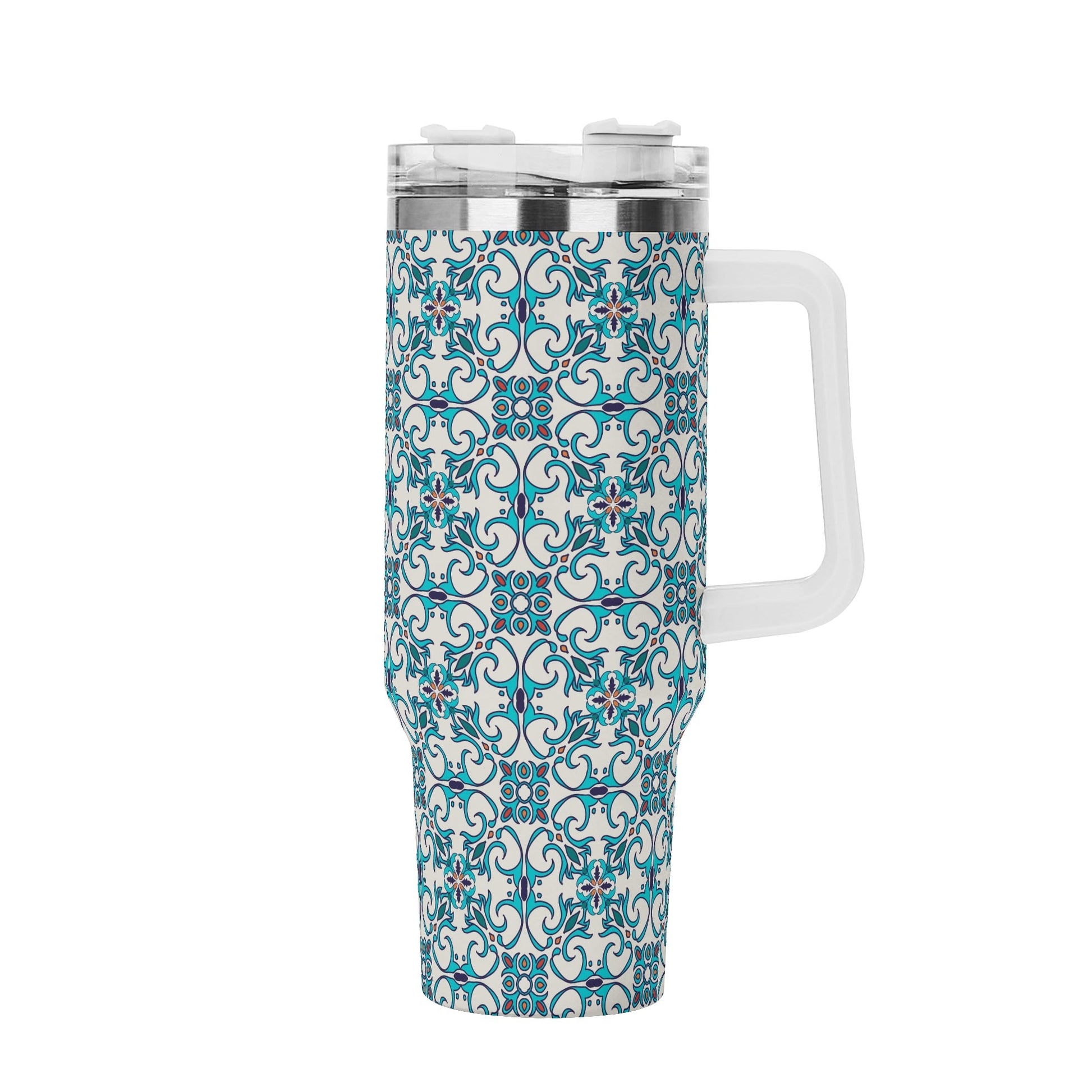 Stay refreshed with this 40oz tumbler, showcasing a striking Portuguese tile-inspired design in vibrant blue, teal, and red. With double-wall insulation to keep drinks hot or cold, it’s the perfect blend of elegance and practicality for any adventure.