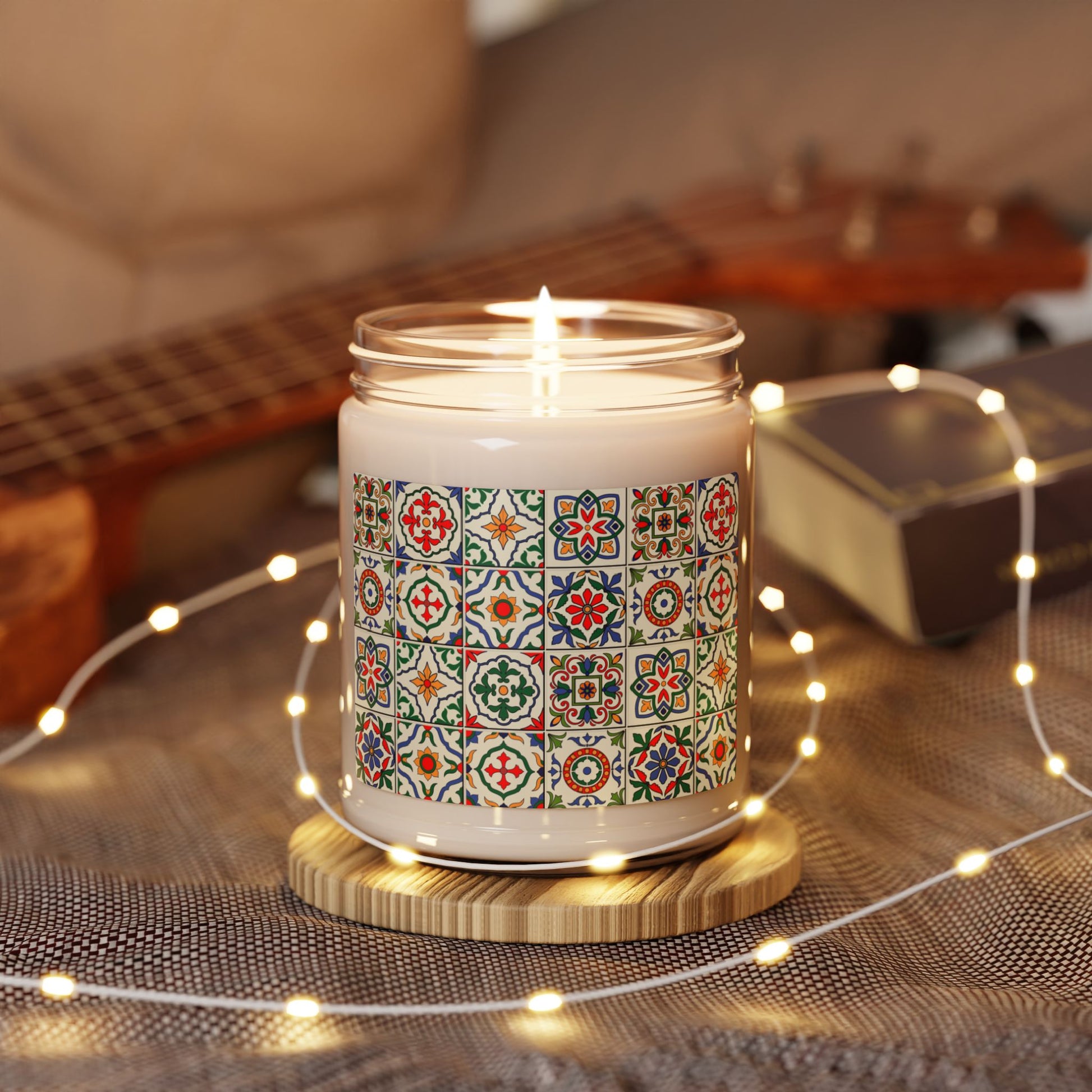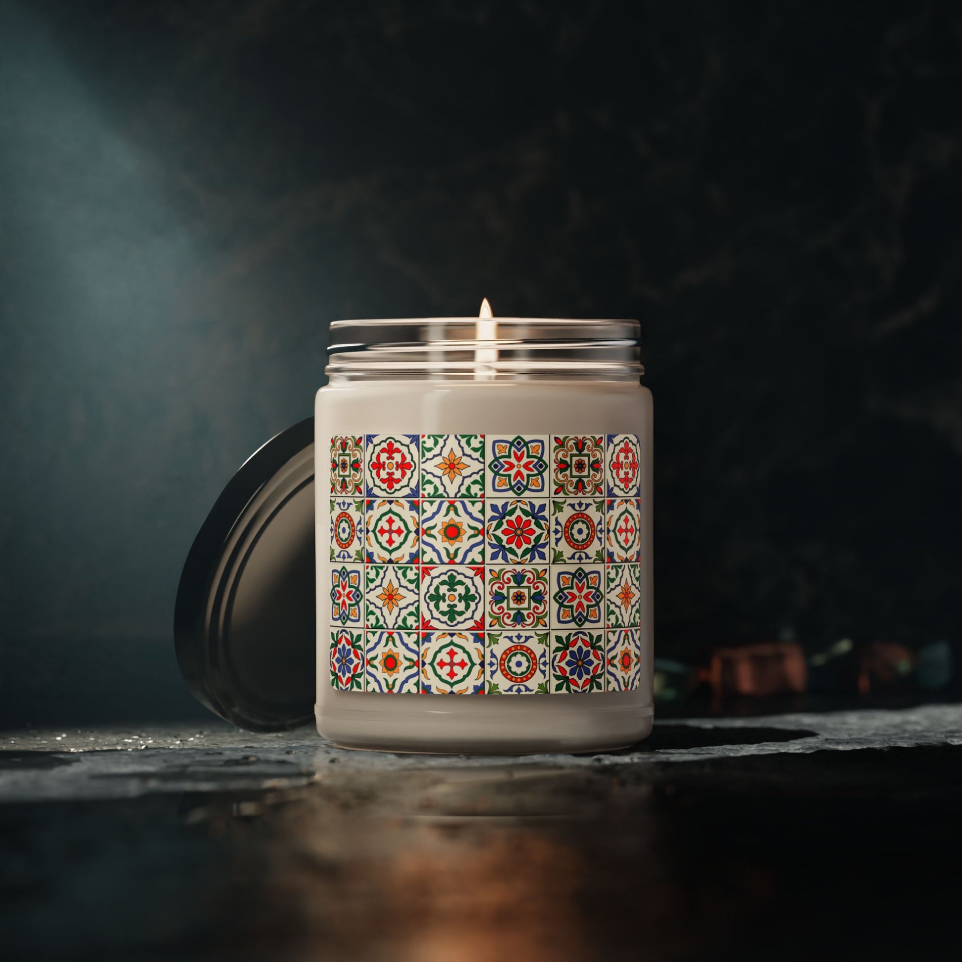 Illuminate your space with the charm of traditional Portuguese design and soothing aromas. This candle features a vibrant, multicolored azulejo tile pattern, adding a touch of artistry and culture to any room. Packed with immersive aromas, these scented candles come in 9oz glass jars and are one size (2.8″ × 3.5″) (7.1cm × 8.8cm), perfect for cozy home decor. Made with a 100% natural soy wax blend and featuring a 100% cotton wick, this candle not only enhances the ambiance but also offers a clean, eco-friendly burn. Bring warmth, light, and tradition to your living space with this elegant candle.