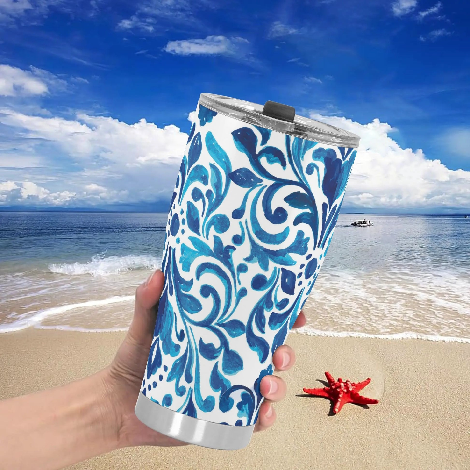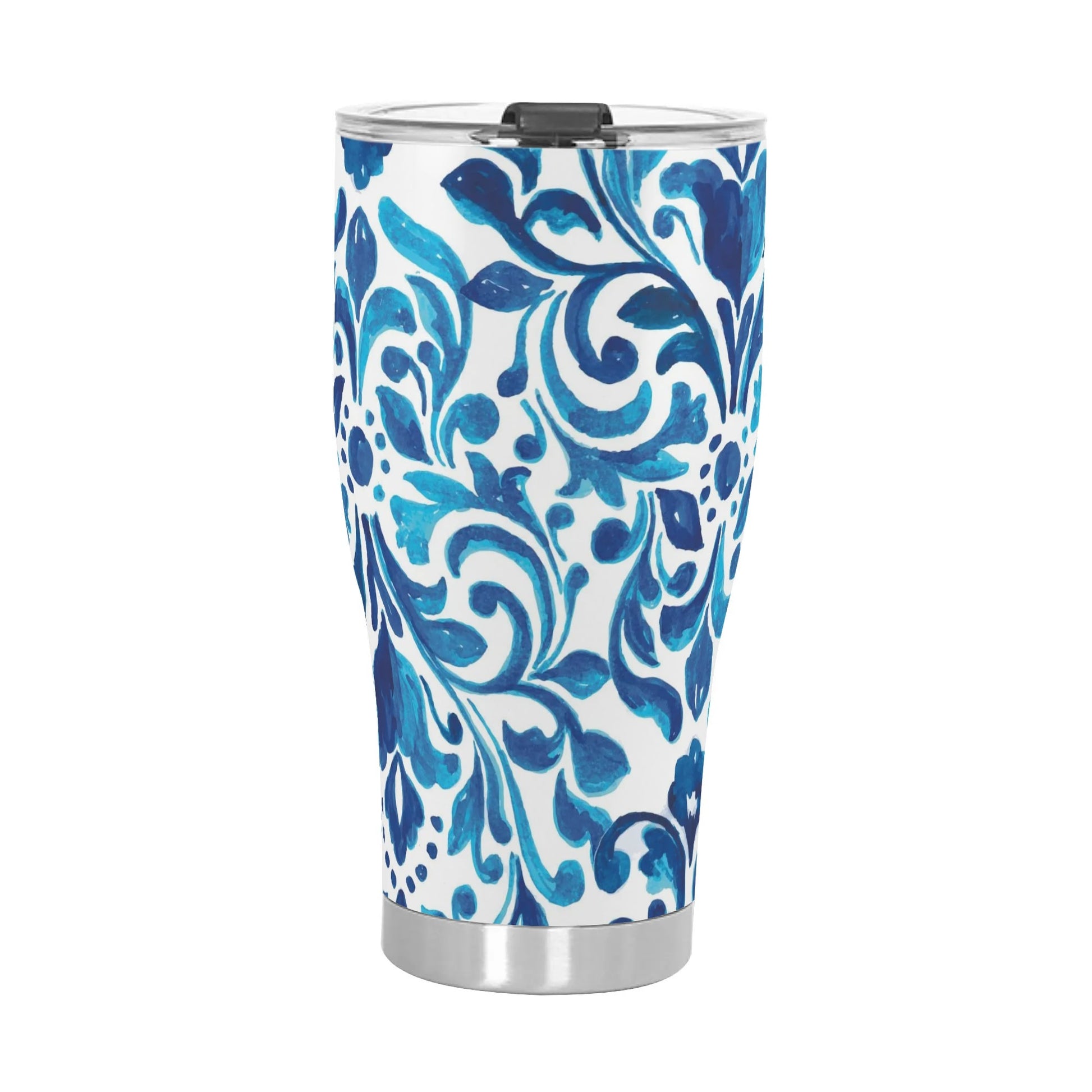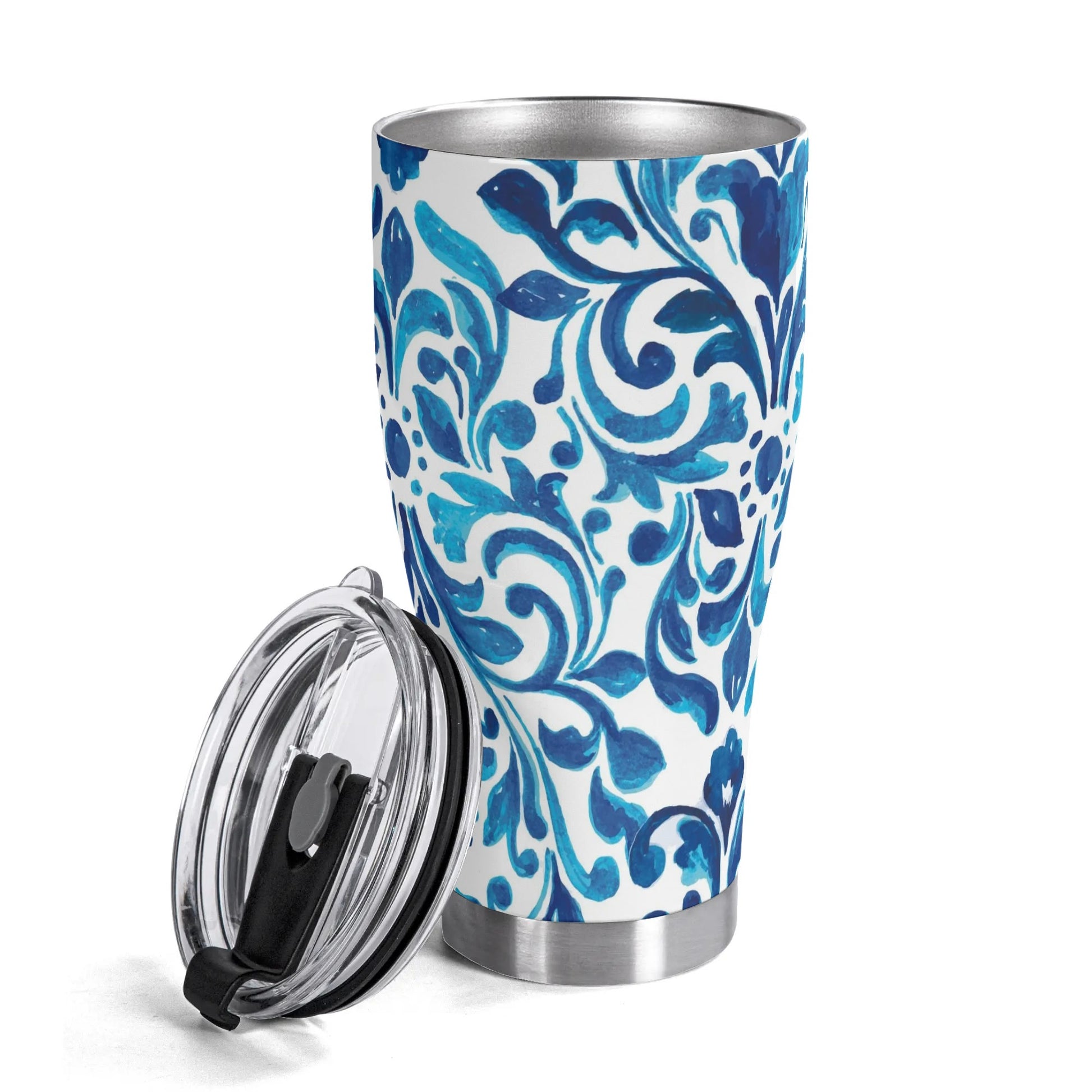 Introducing our stainless steel tumbler adorned with vibrant blue and white scroll pattern. Perfect for hot and cold beverages, it features a secure lid and double-wall insulation for optimal temperature retention.