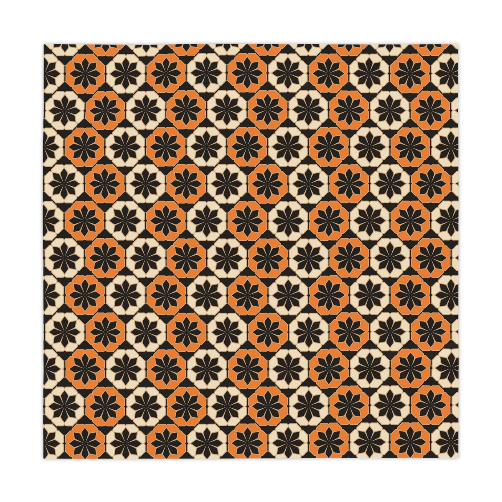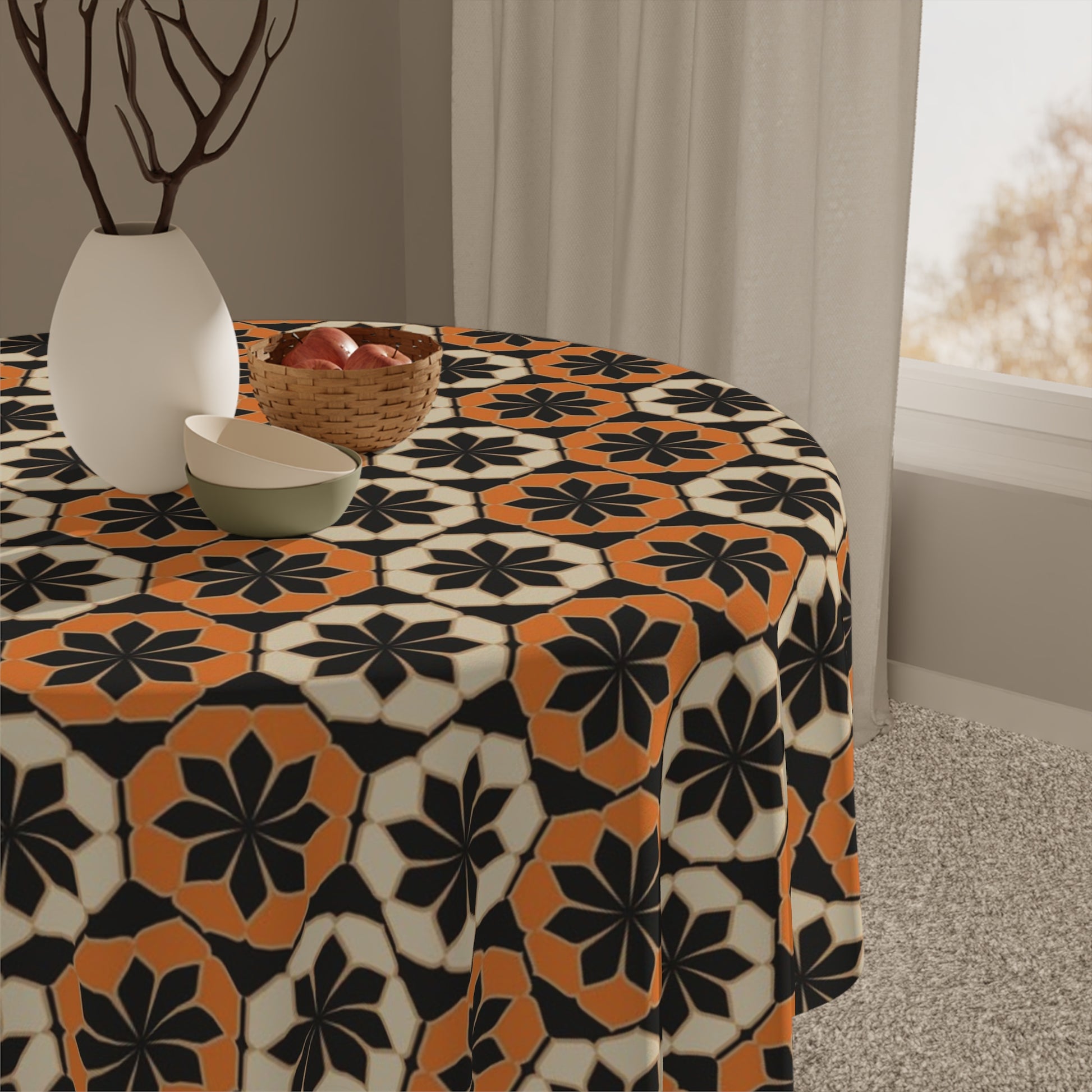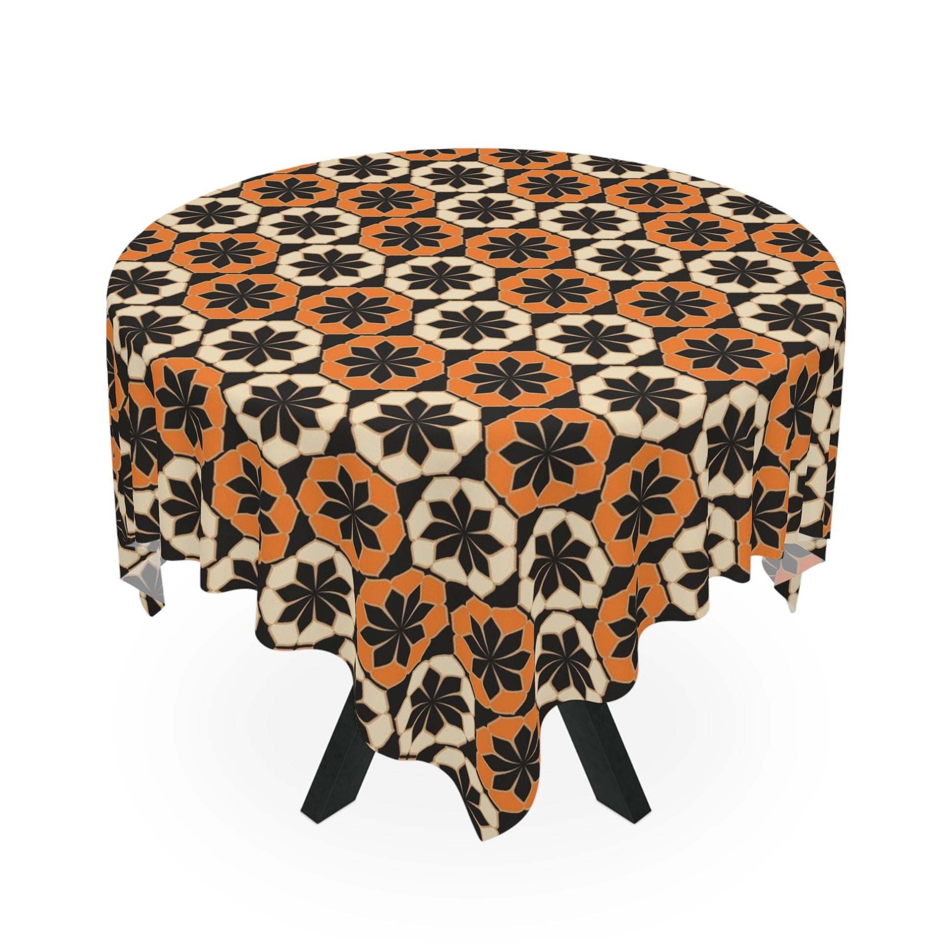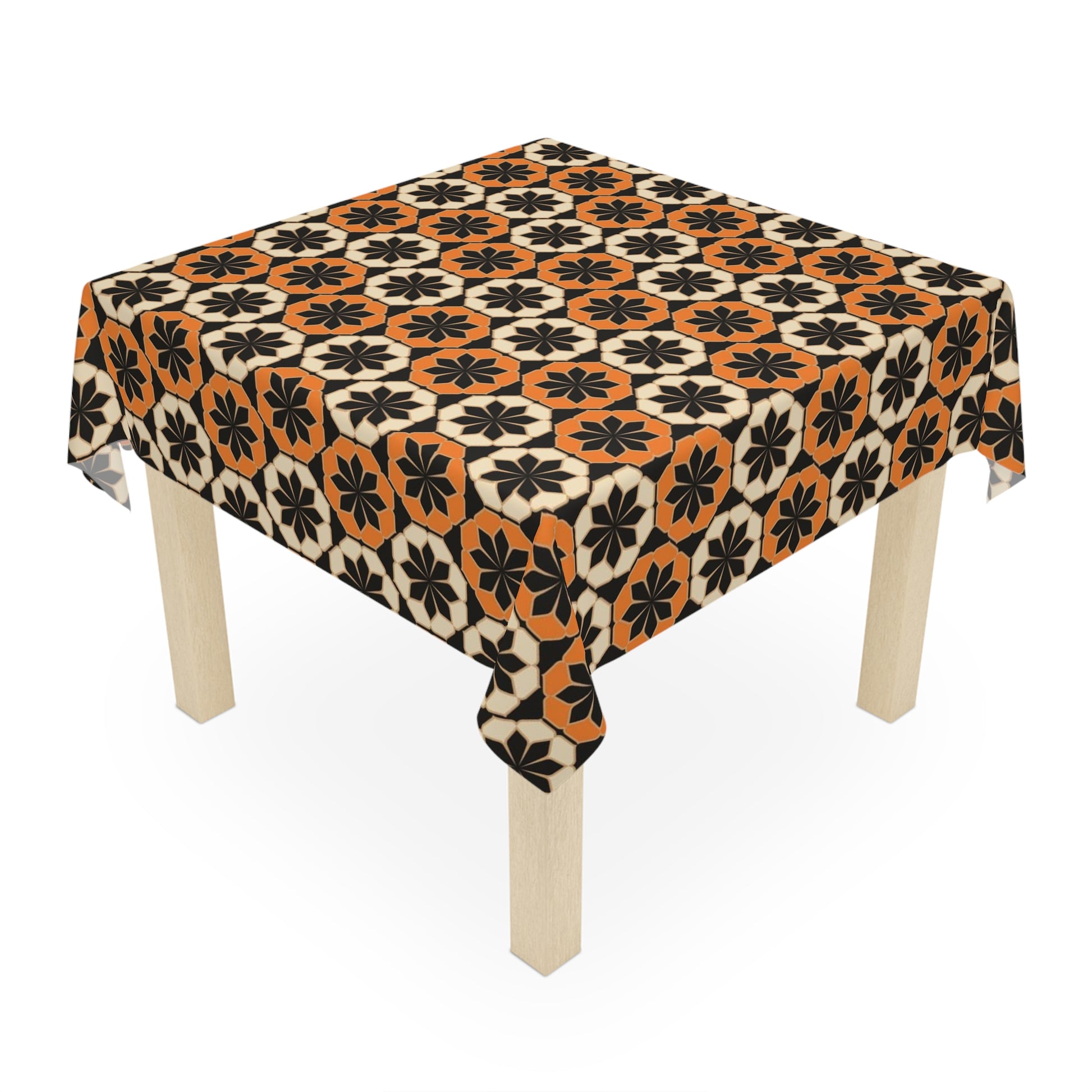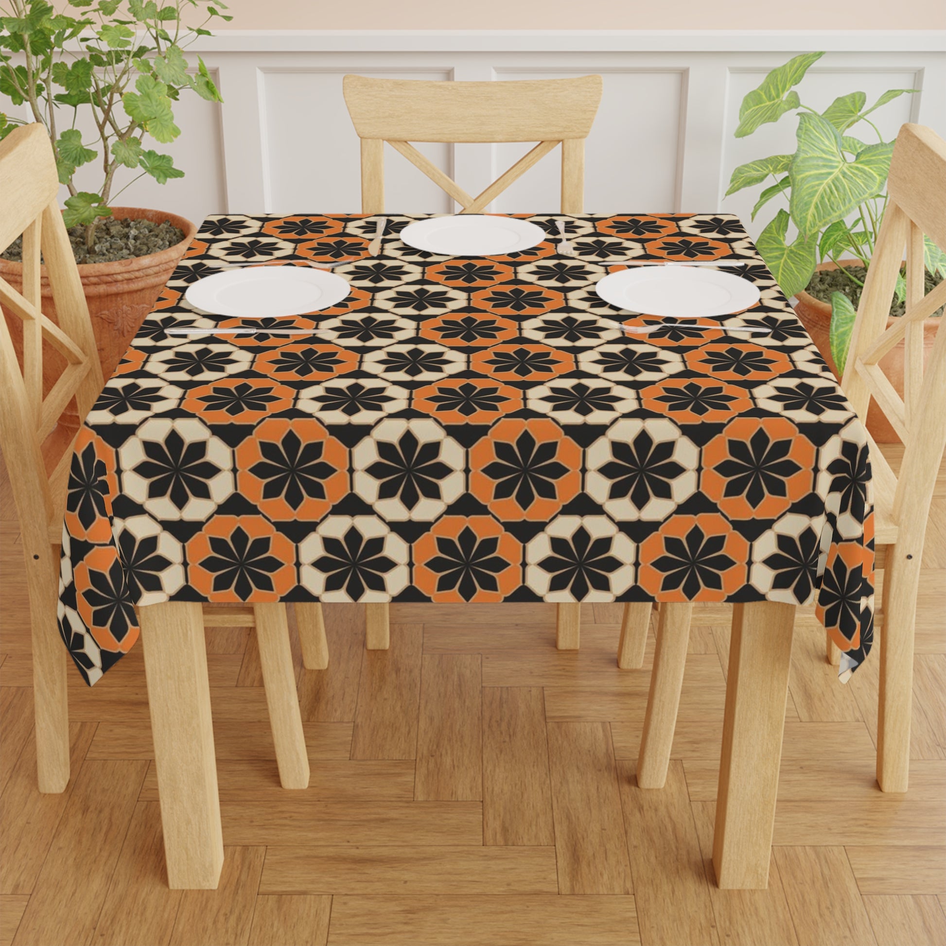 Enhance your dining experience with this stunning tablecloth featuring a bold, geometric pattern in warm orange and black tones. Perfect for adding a touch of sophistication to any table setting, this tablecloth is ideal for both everyday use and special occasions.