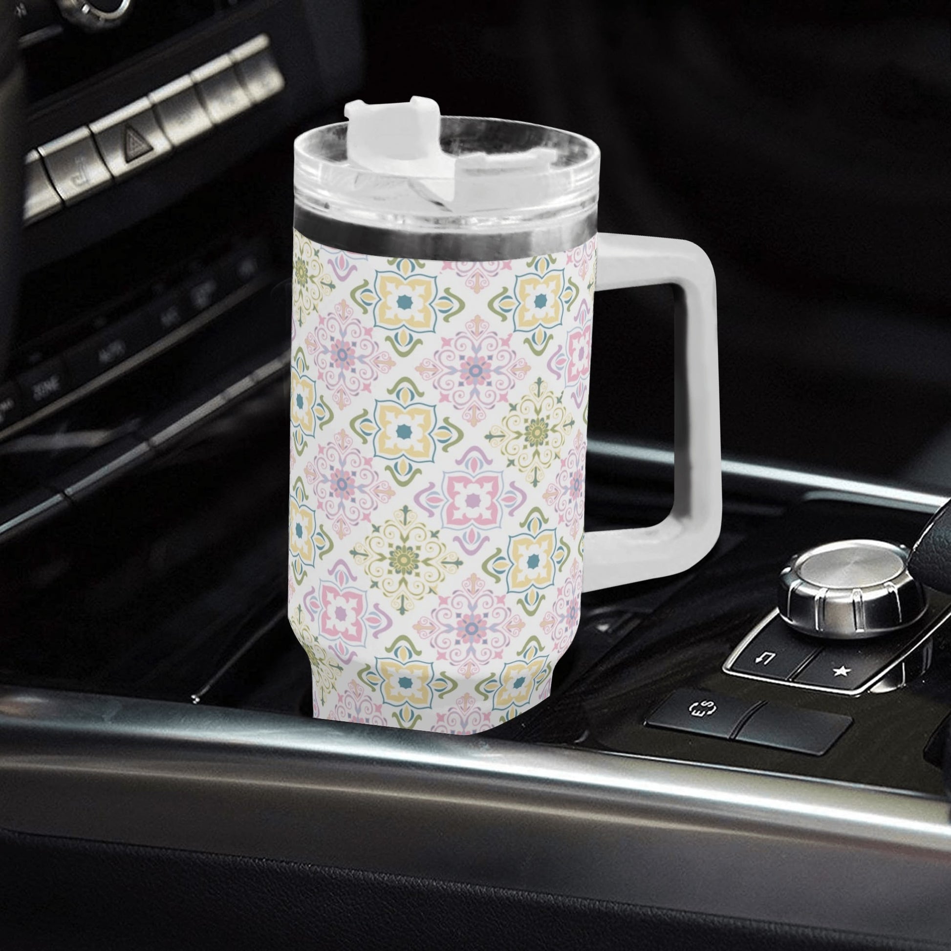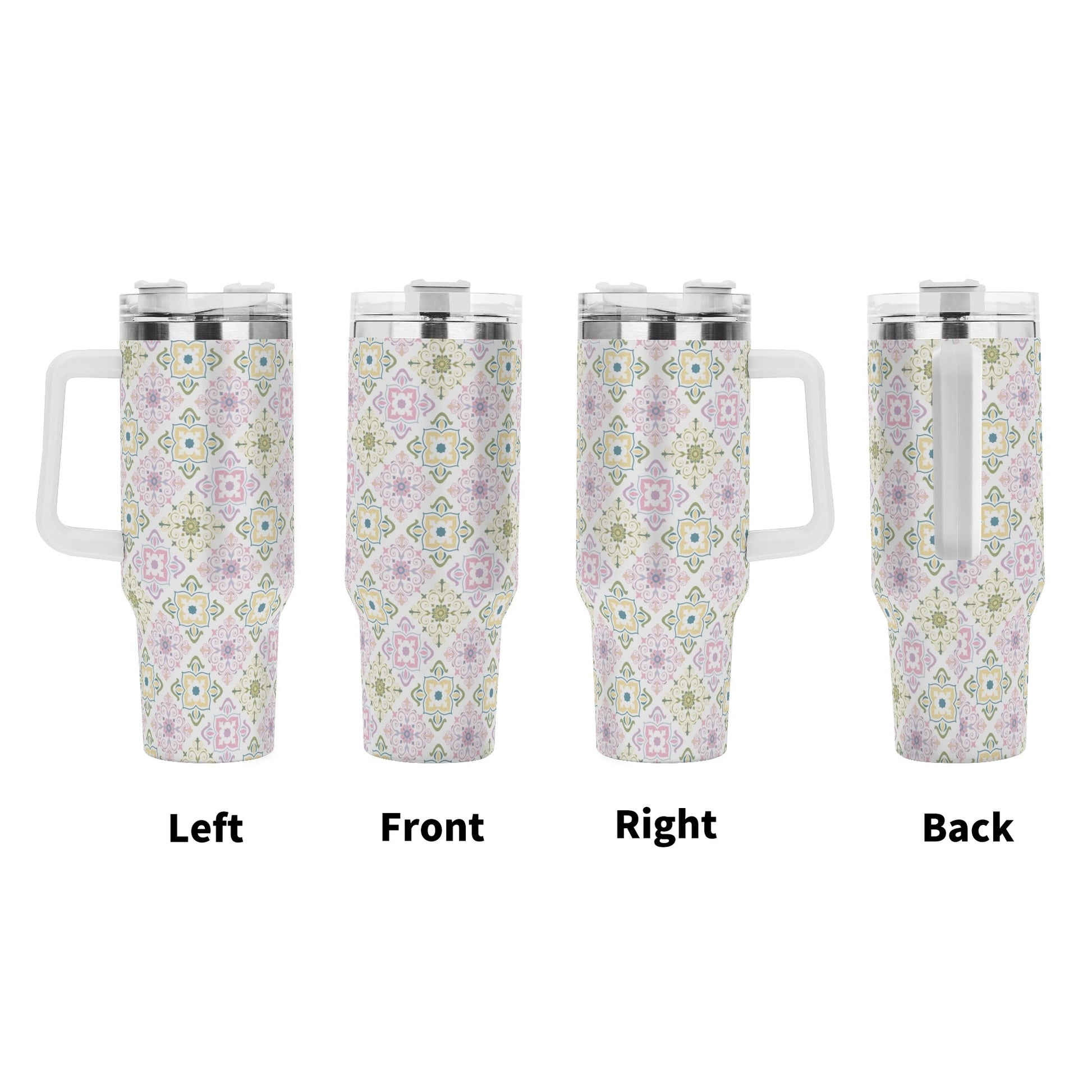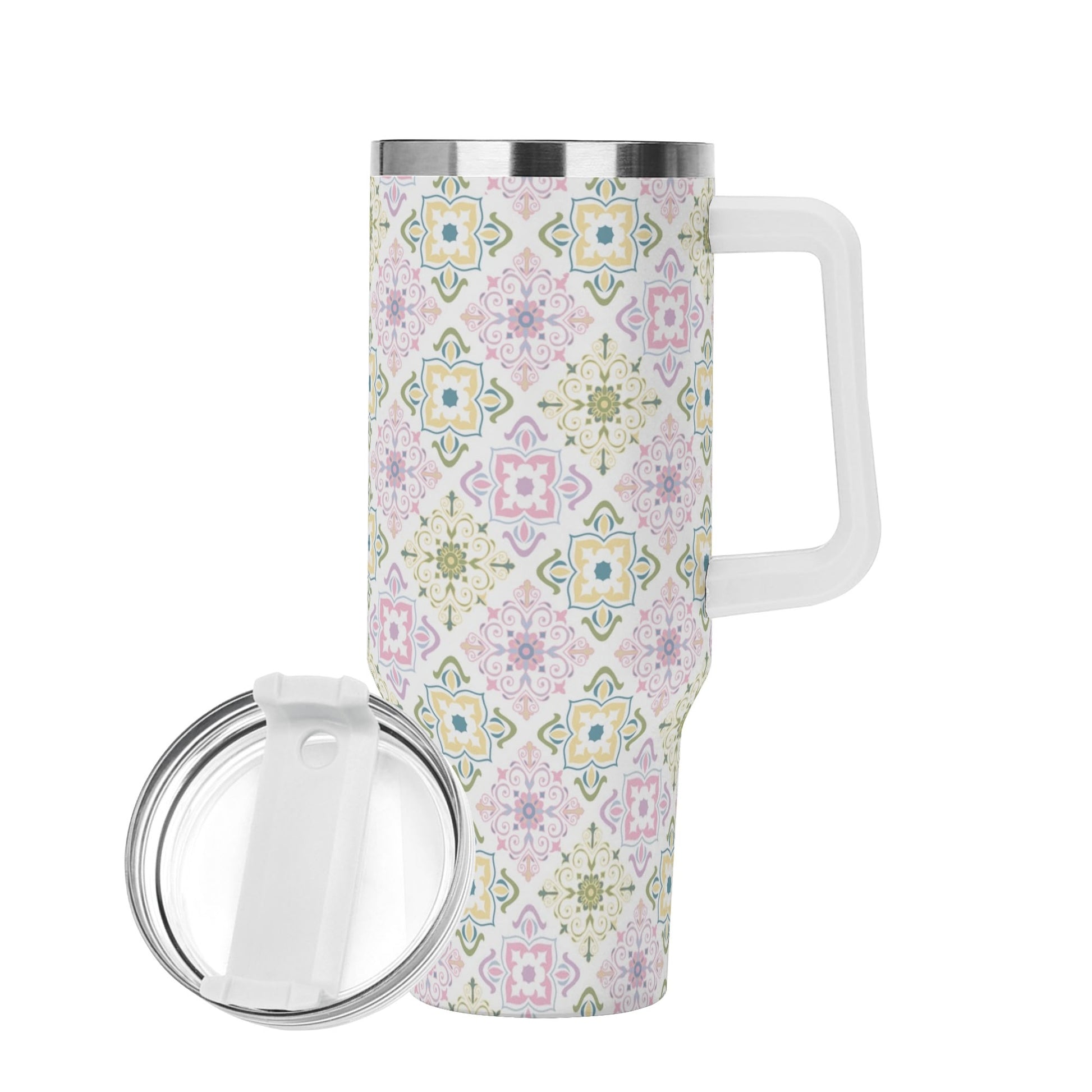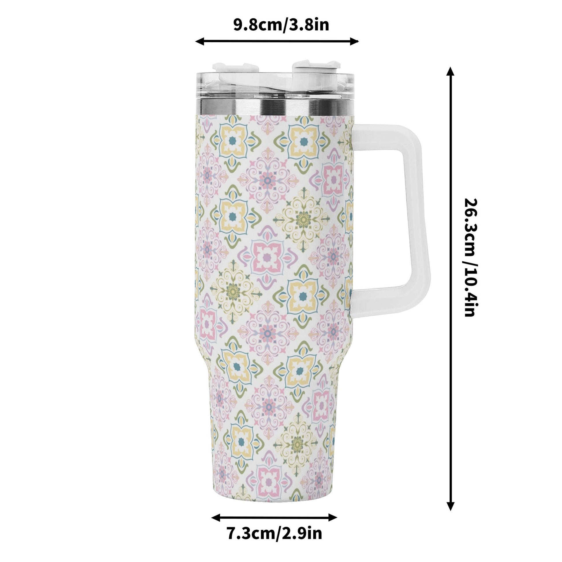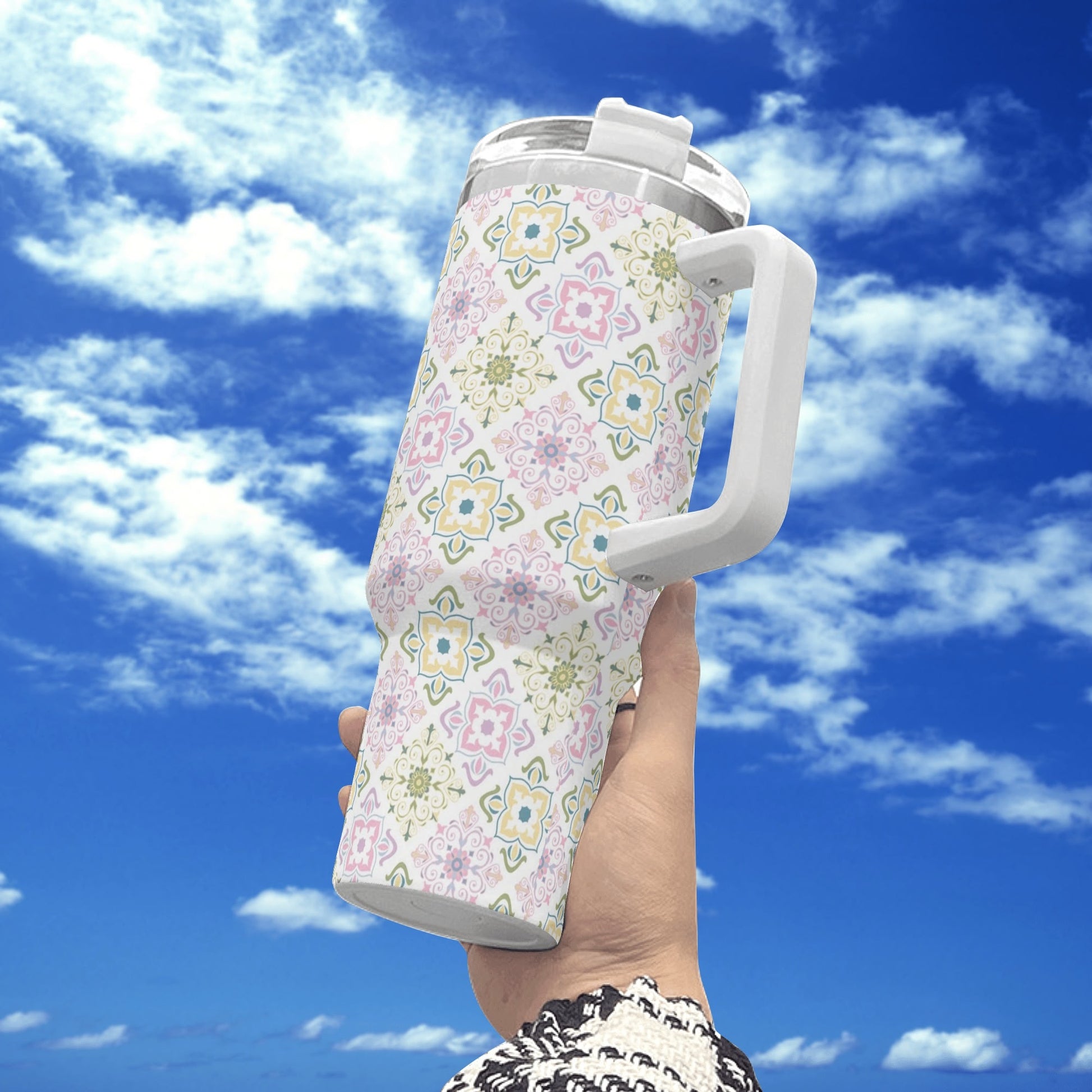 Celebrate spring with this 40oz tumbler, featuring a delightful pastel tile pattern in soft greens, purples, and yellows. Perfectly insulated to keep drinks hot or cold, it’s a cheerful and functional accessory for all your seasonal adventures.