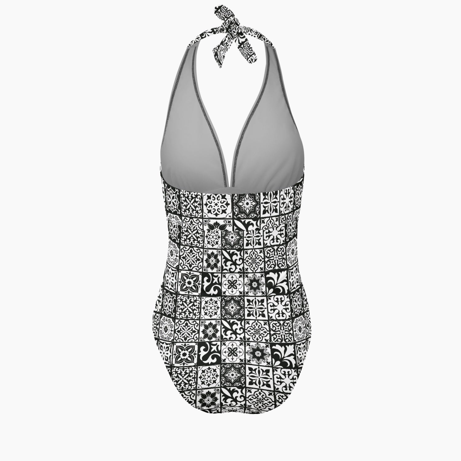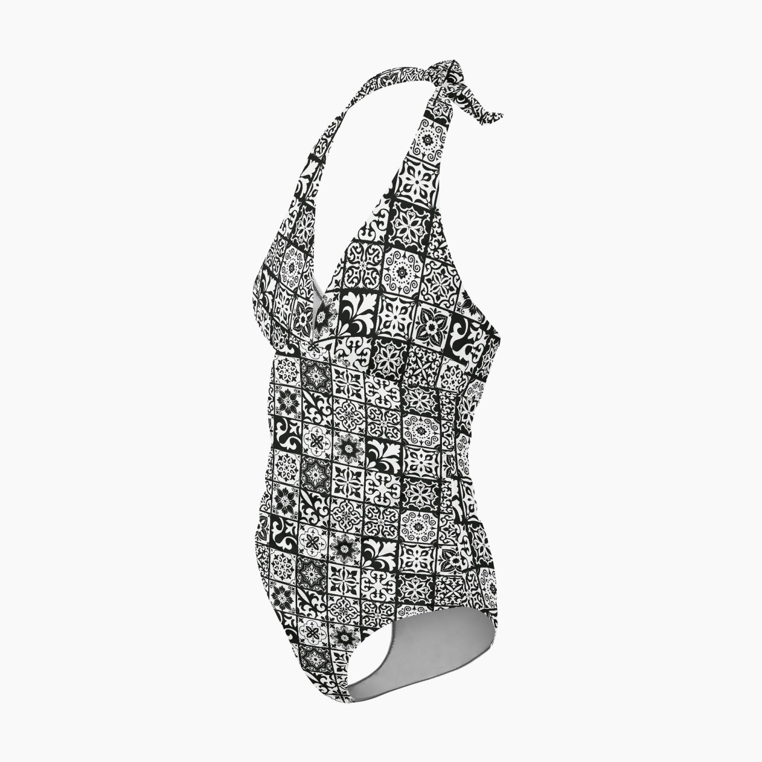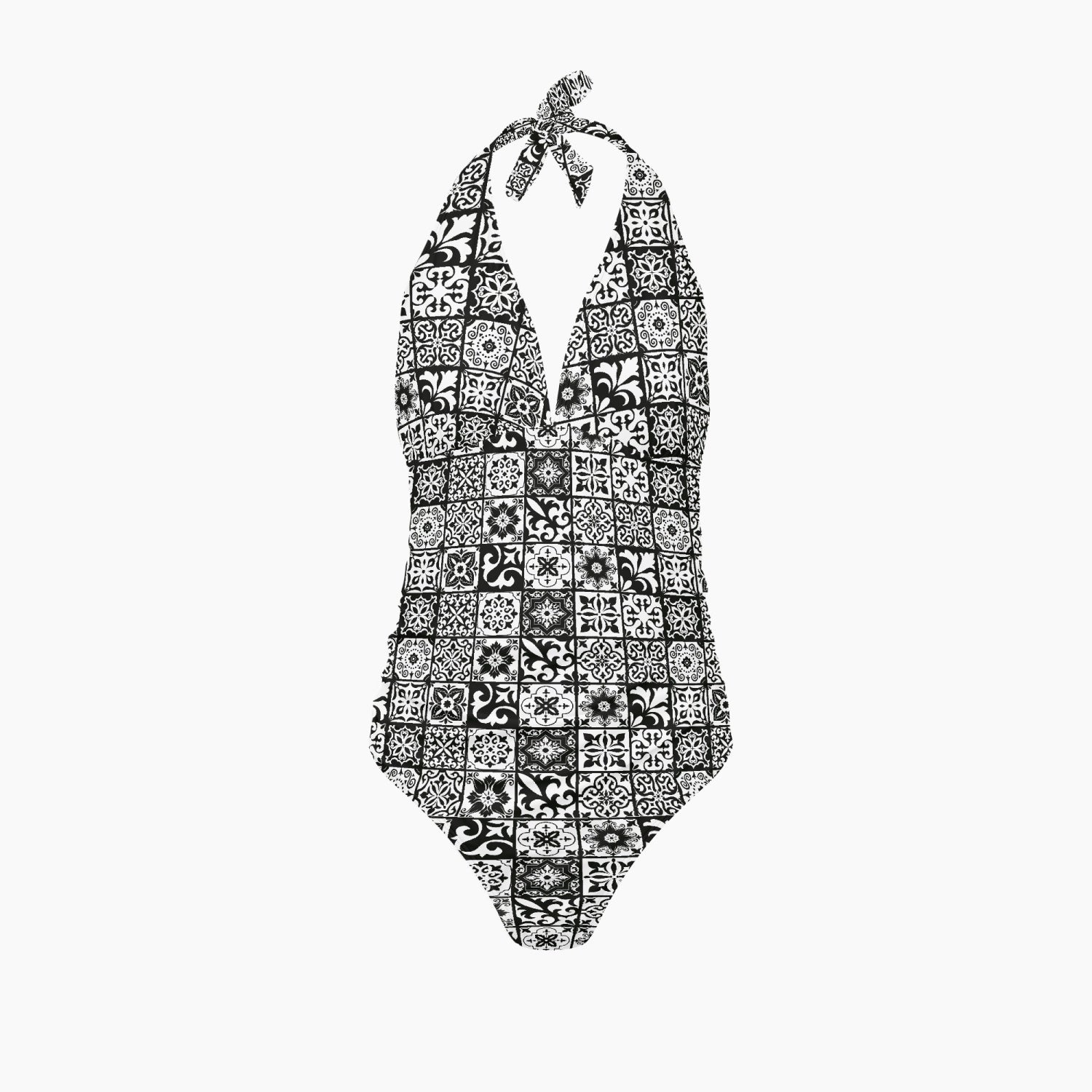 Elevate your swimwear collection with our Preto Women's Halter Top One Piece Swimsuit, showcasing a sophisticated black and white Portuguese tile pattern. The sexy V-neck design is crafted to highlight your curves, ensuring you look both elegant and chic. With adjustable halter straps for a personalized fit, this swimsuit offers optimal support and comfort for all-day wear. Perfect for poolside lounging or beach outings, this stylish piece combines timeless elegance with modern flair. Step into the sun with confidence and grace, turning heads with every step in this exquisite swimsuit.