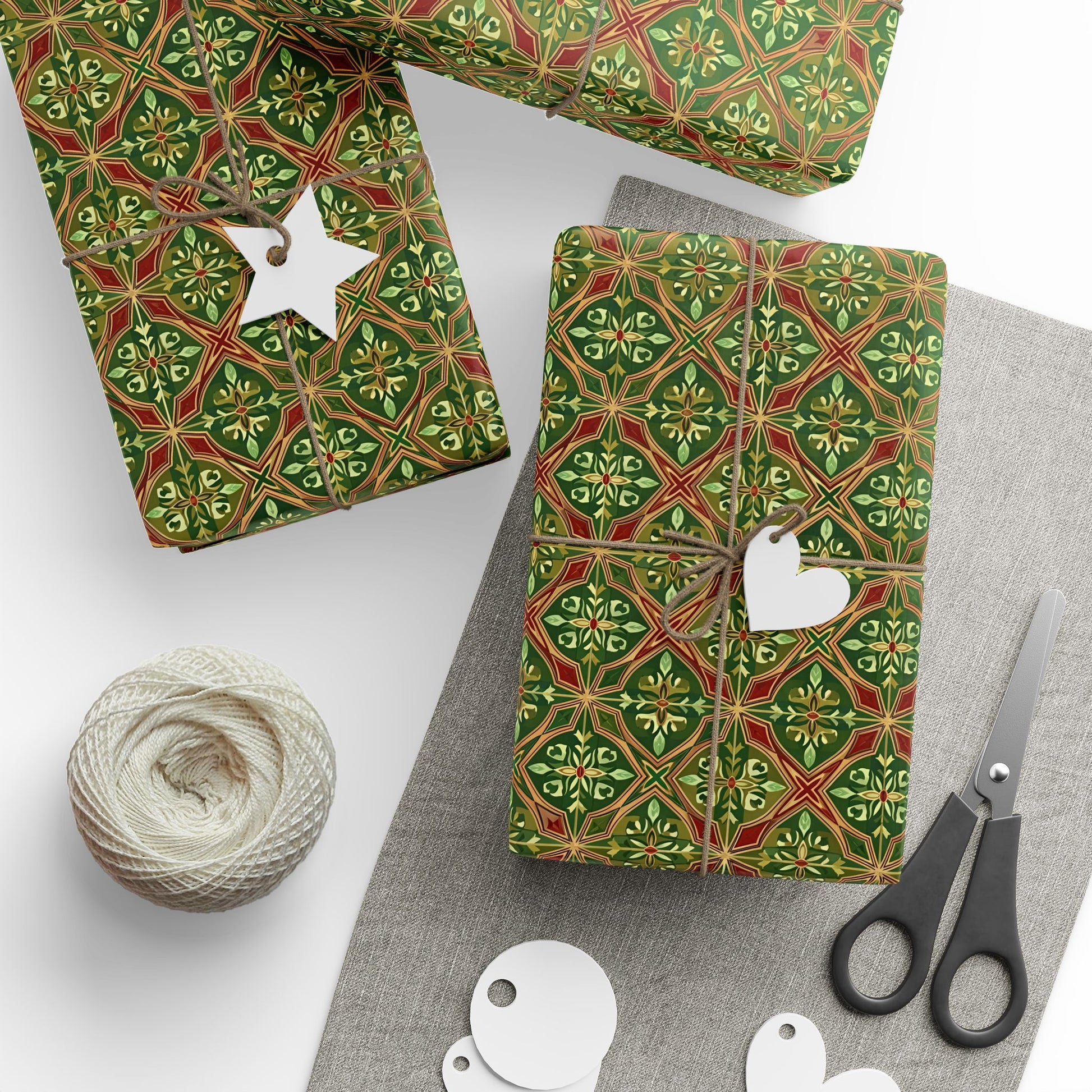 Bring a touch of festive grandeur to every gift. The Reis Wrapping Paper features rich, hand-drawn tilework in deep greens and warm reds, creating a regal holiday palette inspired by traditional Portuguese motifs. Each repeat feels lush and intricate, with leafy flourishes and geometric lines that echo classic azulejo artistry. The pattern wraps beautifully around boxes of all shapes, folding cleanly and maintaining its bold, ornamental character across large surfaces.