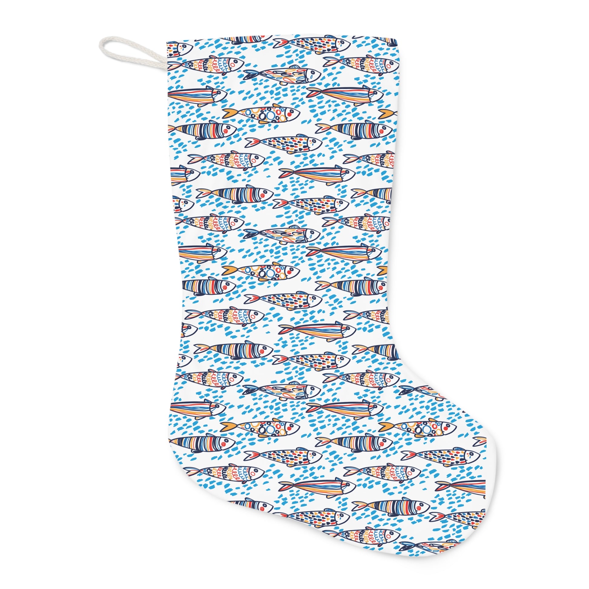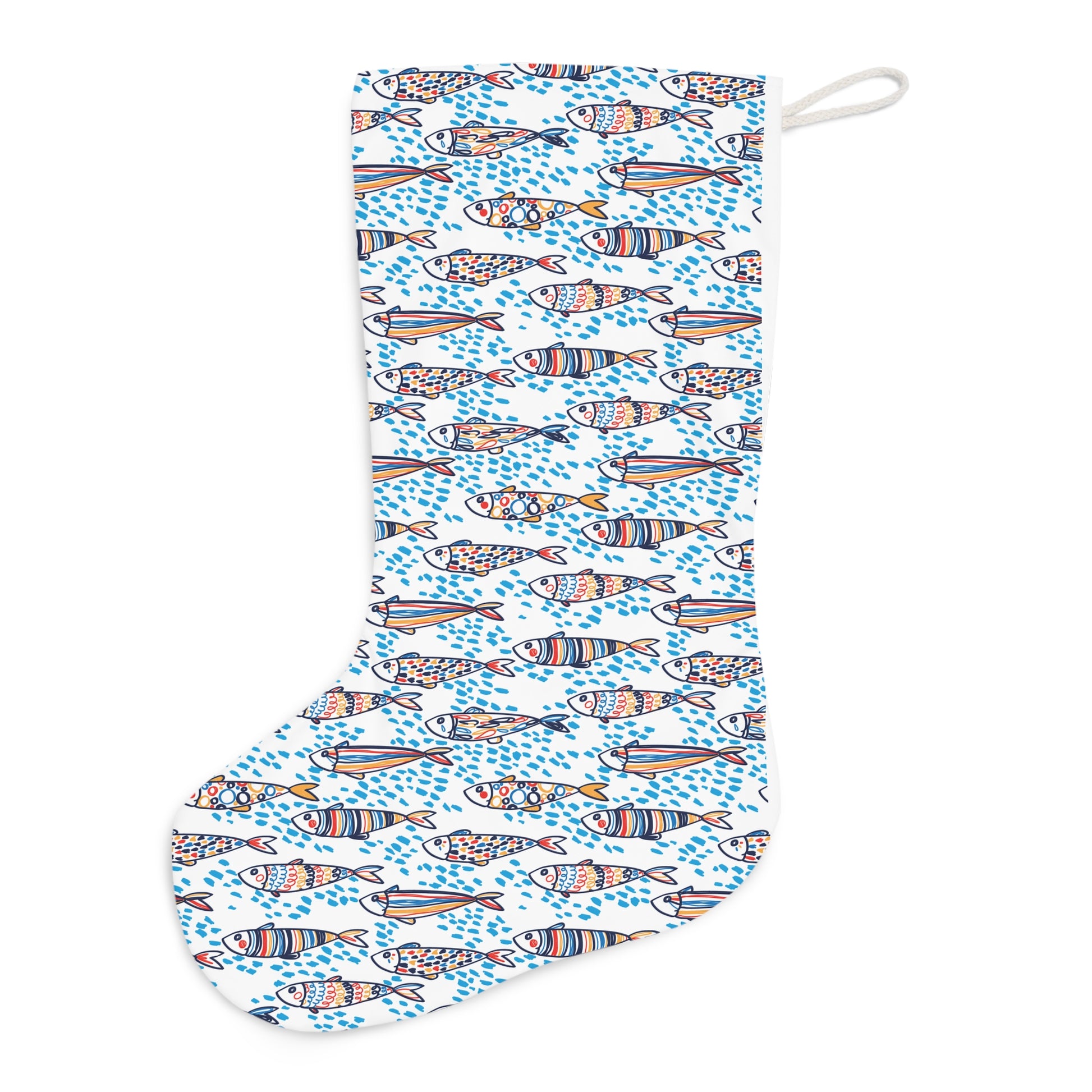 Add a vibrant touch to your holiday decor with this Santa stocking, featuring a vibrant pattern of colorful sardines. Its durable fabric make it a charming and festive addition to your mantle for years to come. Made with luxuriously soft faux suede, this stocking features a hanging loop for convenient placement anywhere around the house.