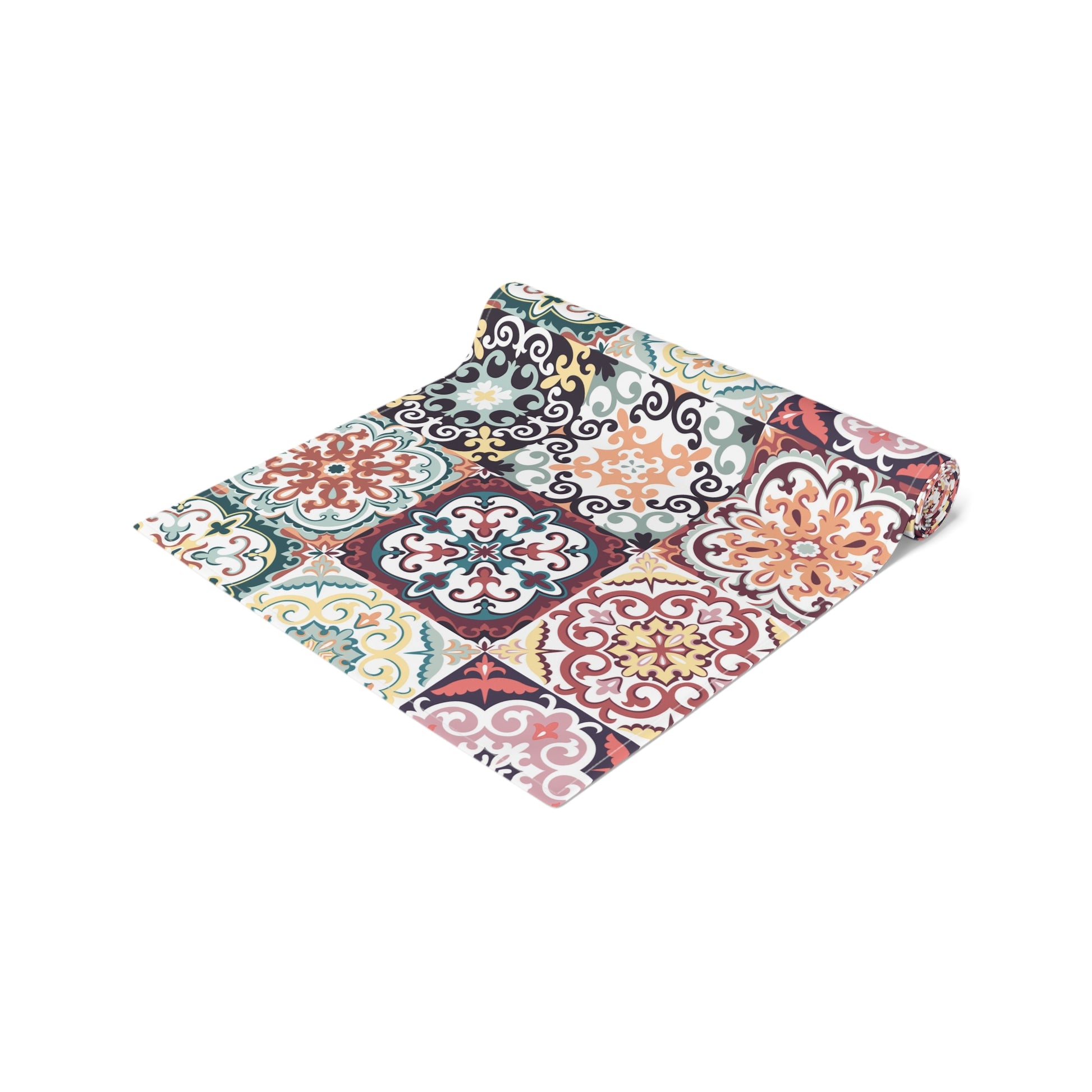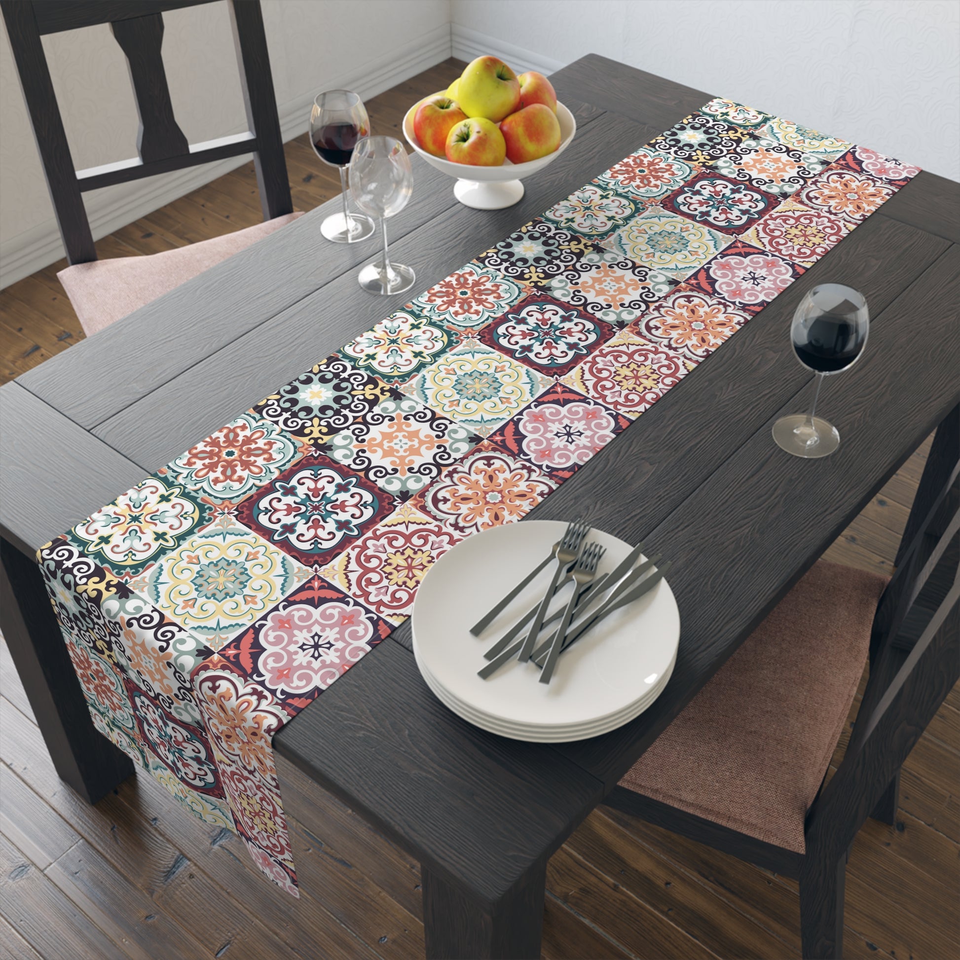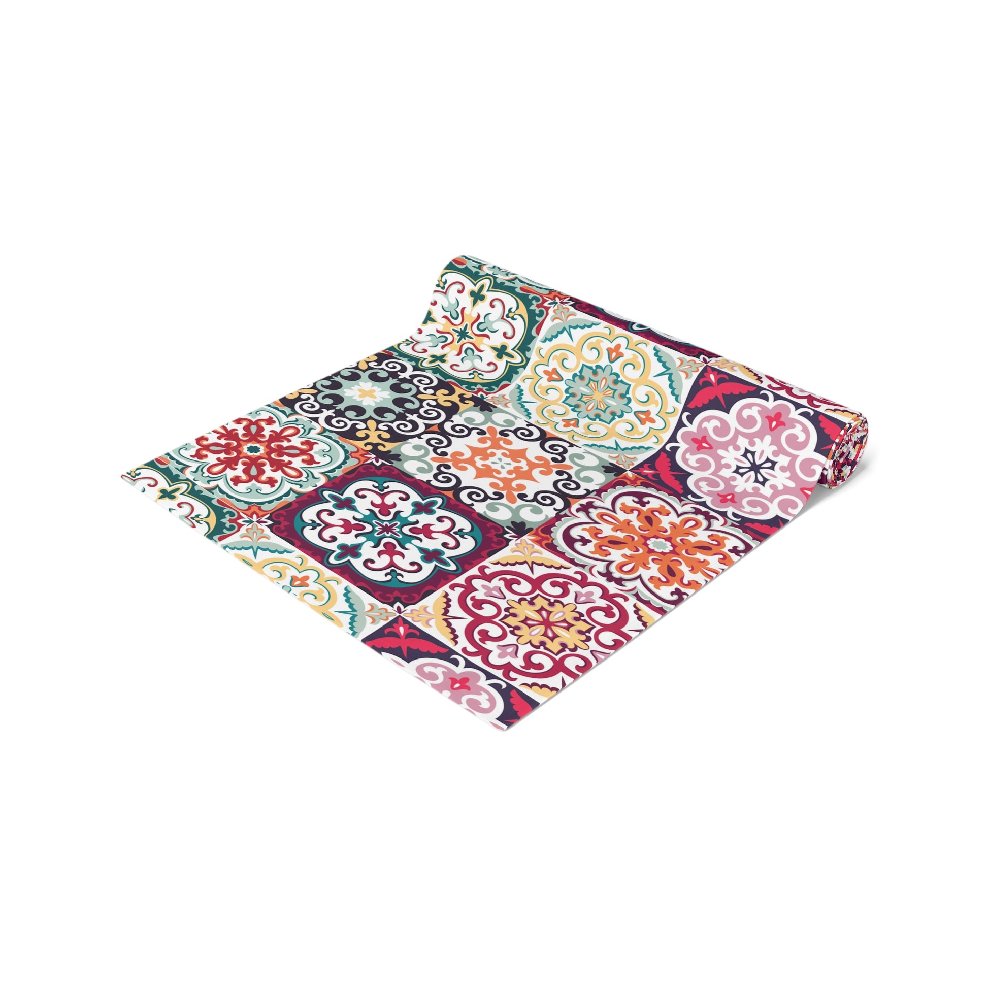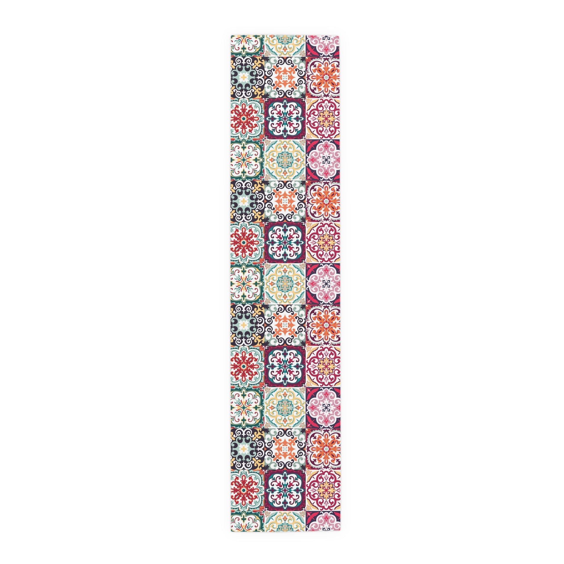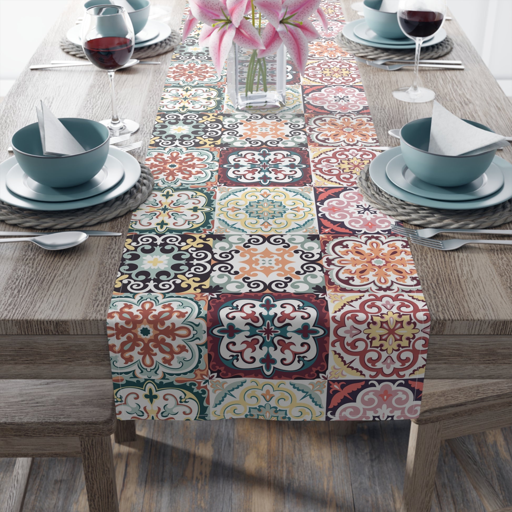 Add a burst of color to your dining space with this vibrant table runner, featuring a stunning collection of intricate tile patterns. Each section showcases unique swirling motifs and floral elements in rich hues of green, yellow, red, purple, orange, and white. Perfect for both casual and formal settings, this table runner brings a touch of Mediterranean charm to your home decor.