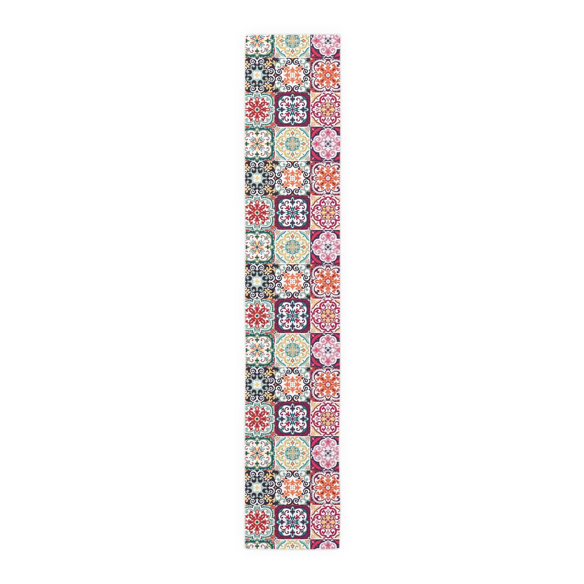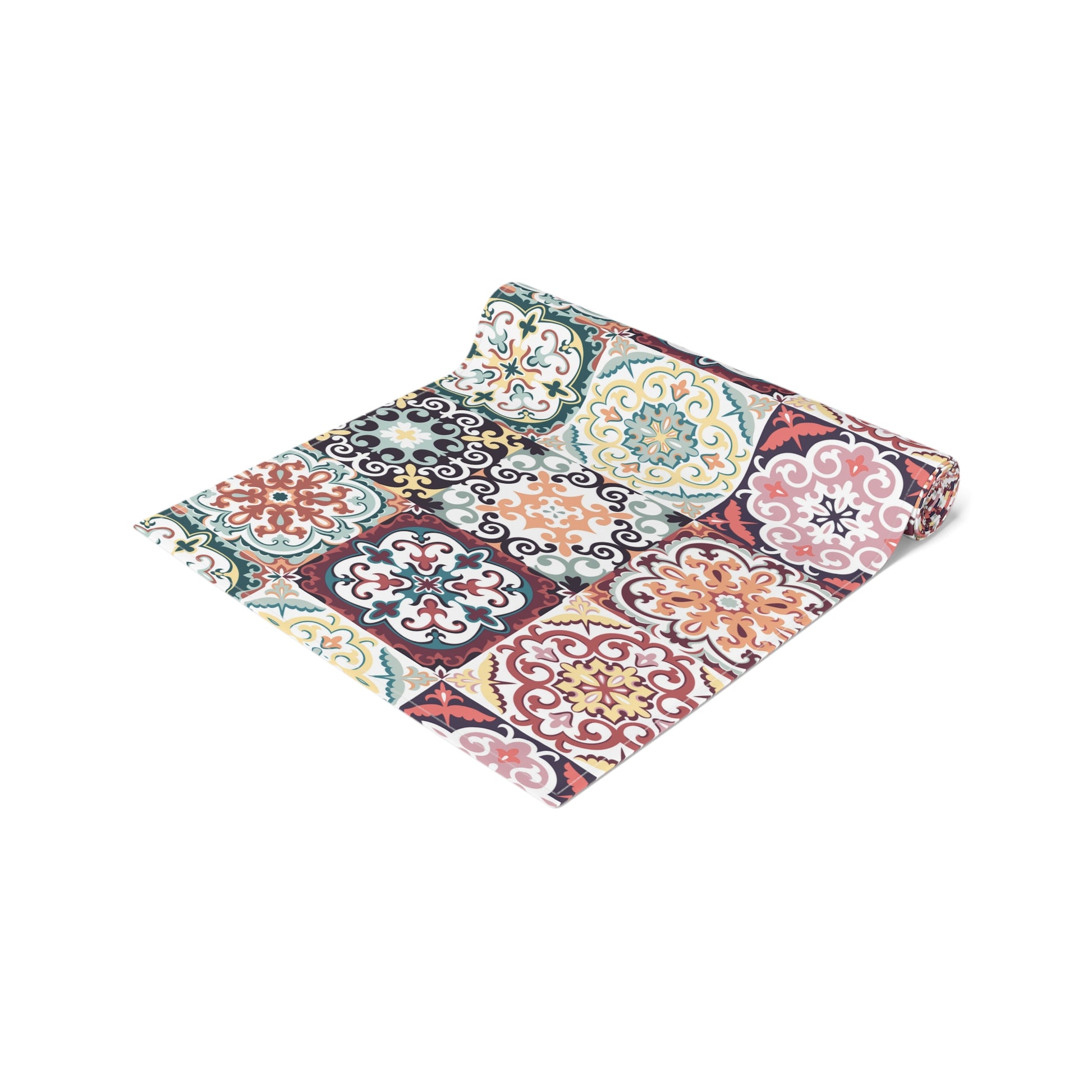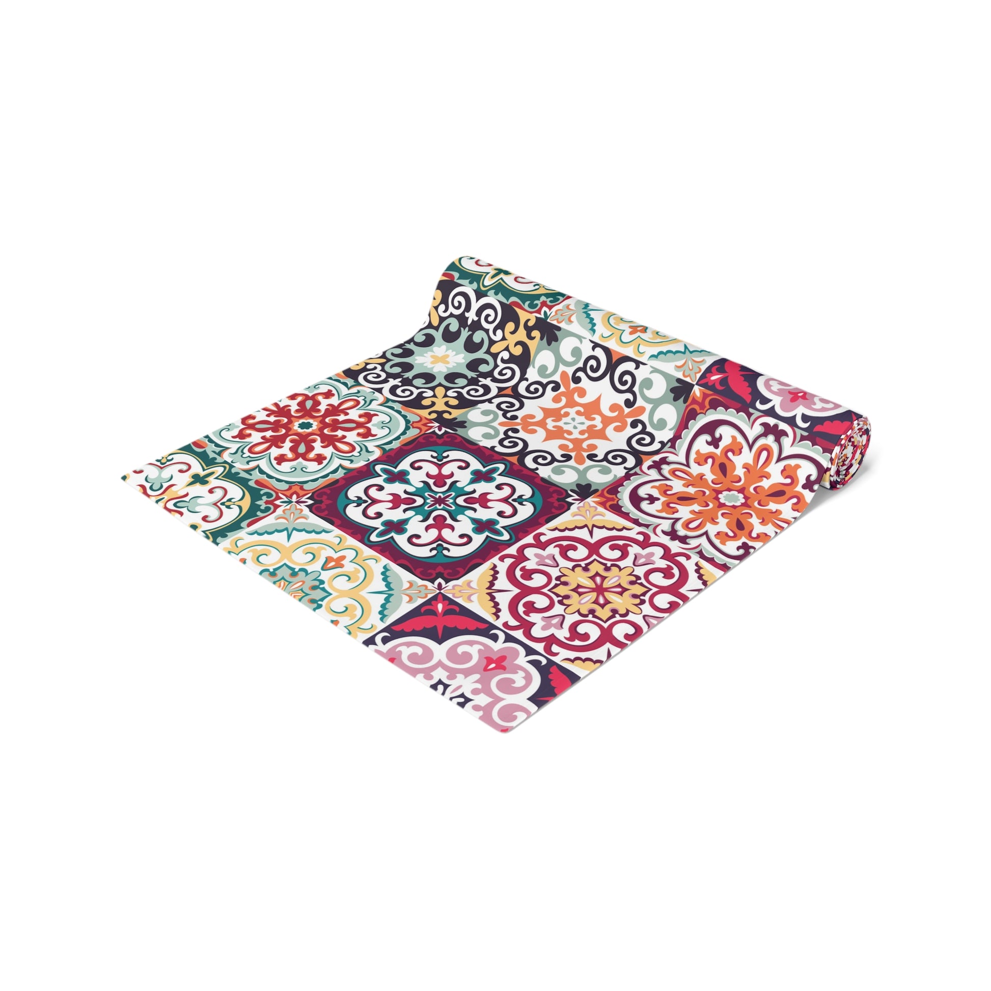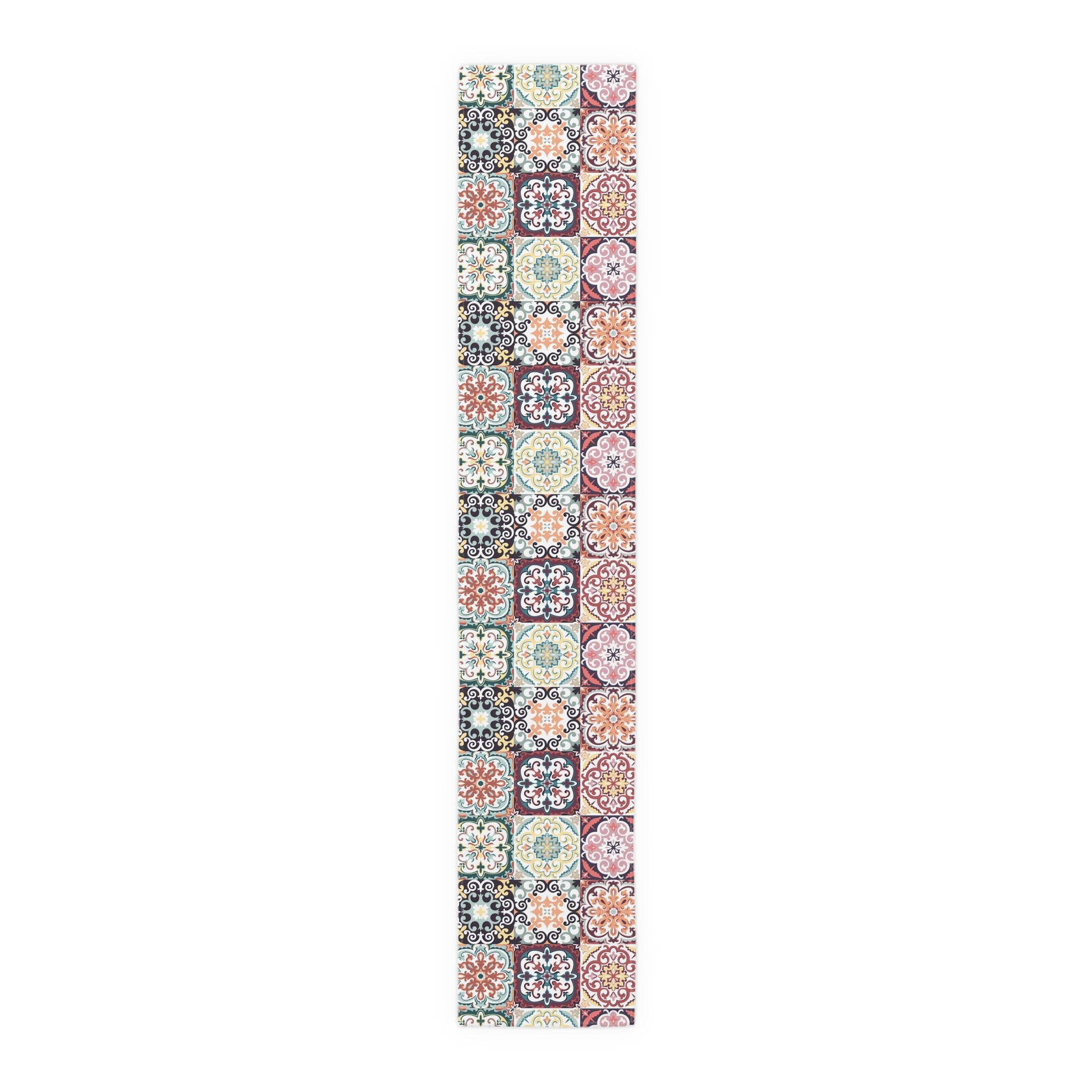 Add a burst of color to your dining space with this vibrant table runner, featuring a stunning collection of intricate tile patterns. Each section showcases unique swirling motifs and floral elements in rich hues of green, yellow, red, purple, orange, and white. Perfect for both casual and formal settings, this table runner brings a touch of Mediterranean charm to your home decor.