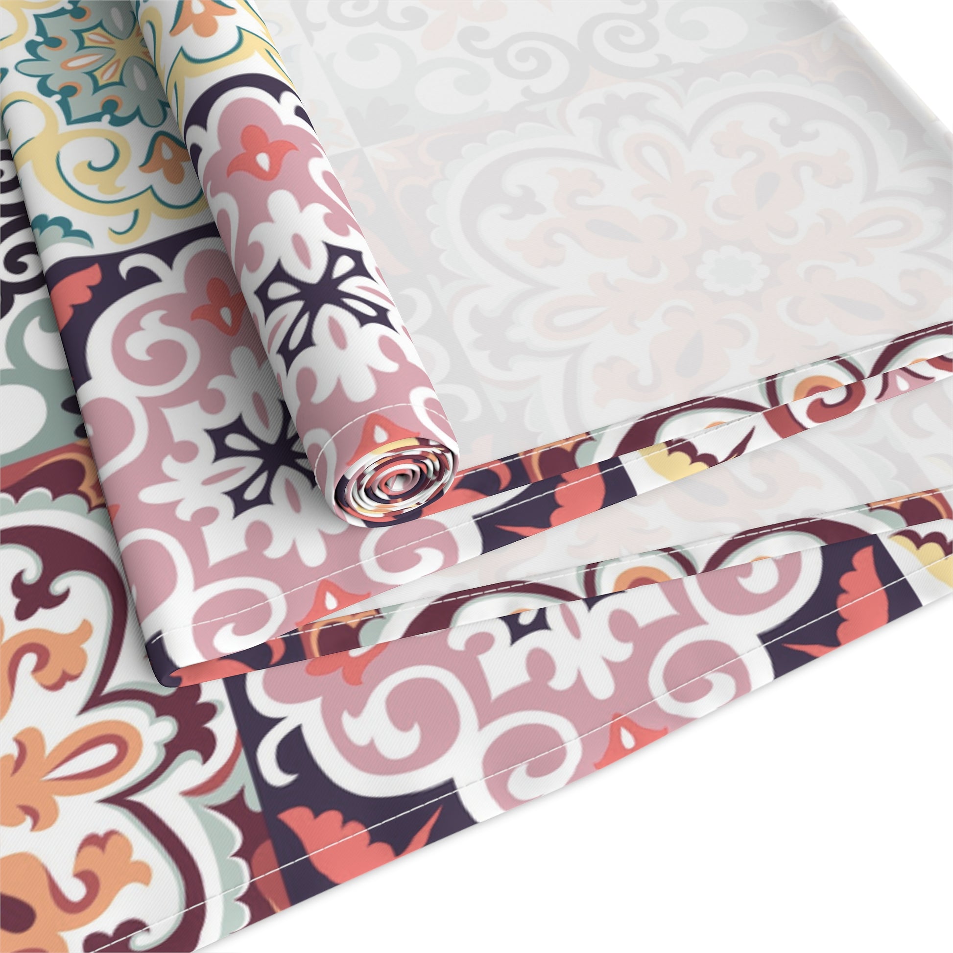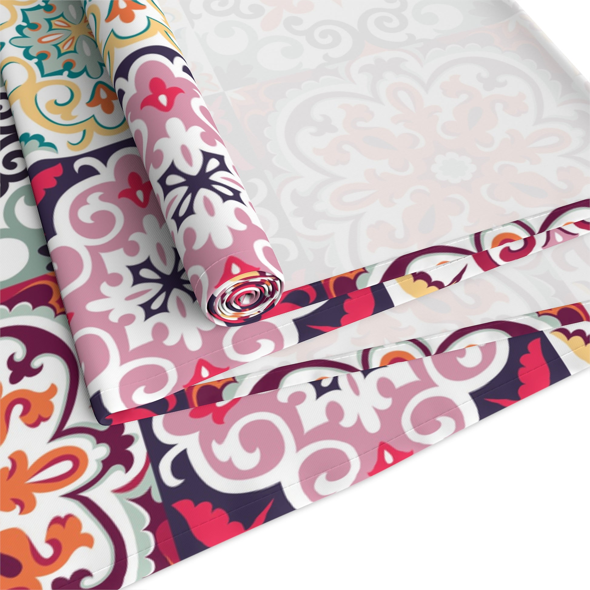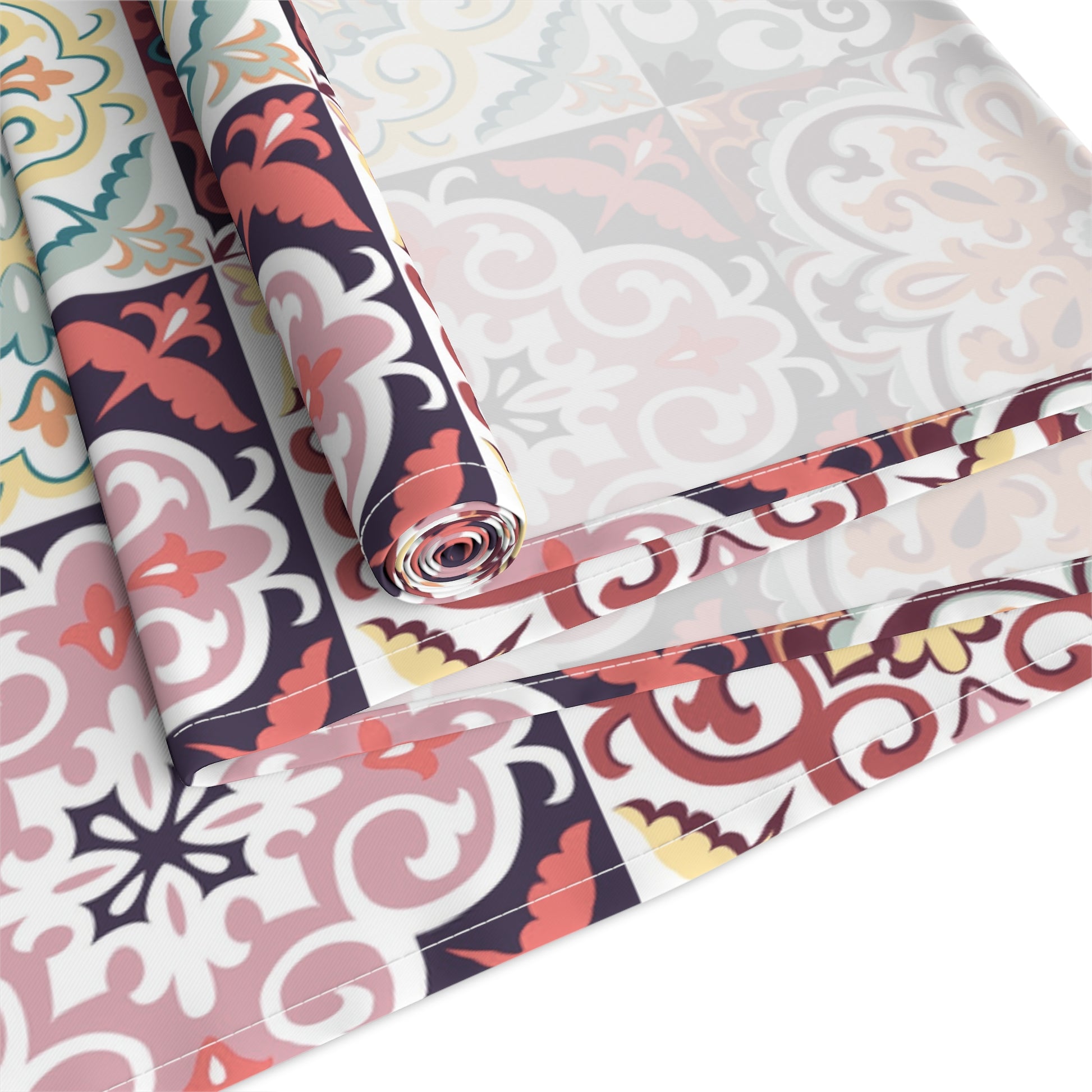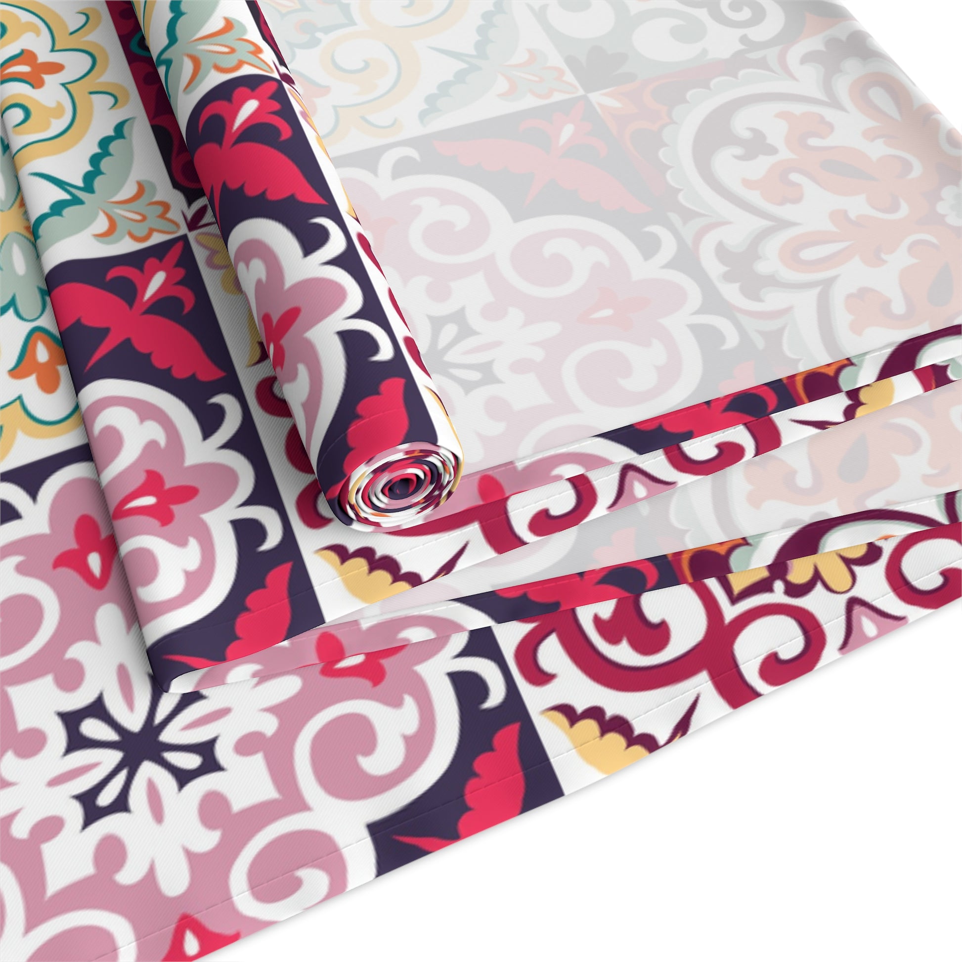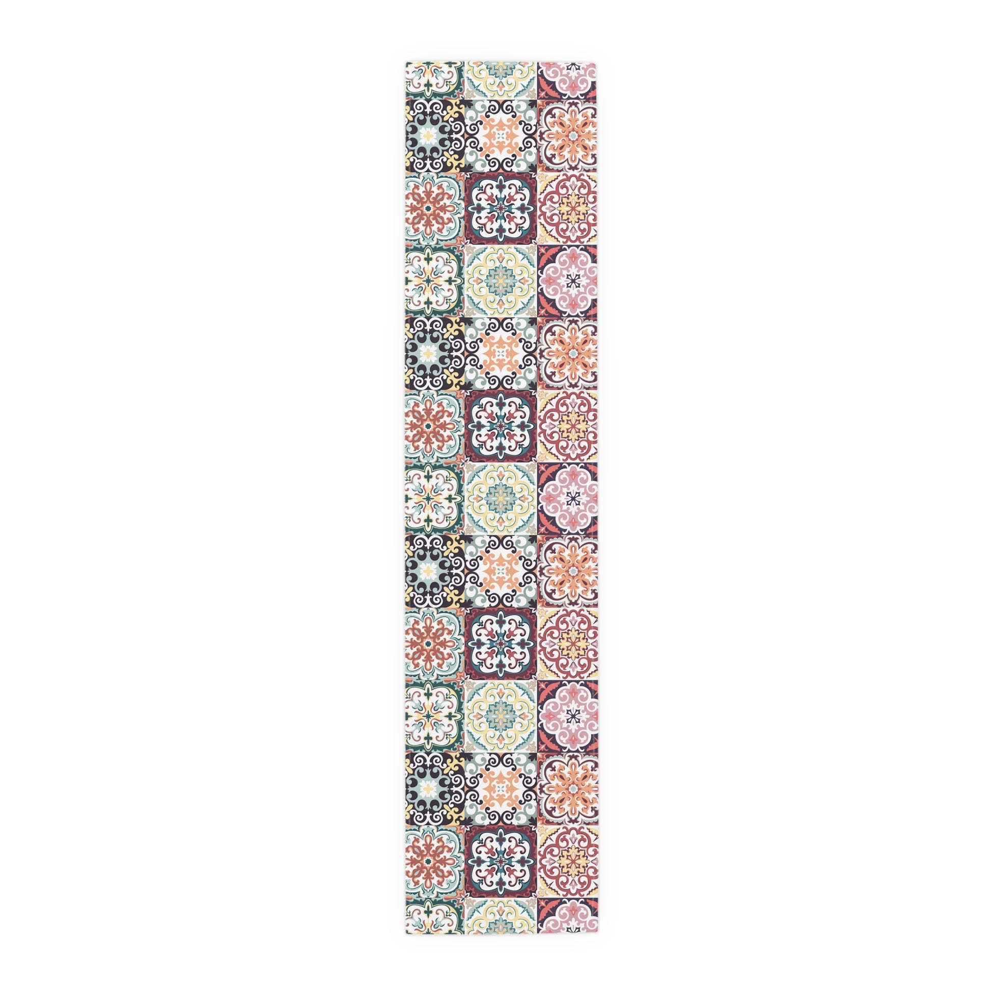 Add a burst of color to your dining space with this vibrant table runner, featuring a stunning collection of intricate tile patterns. Each section showcases unique swirling motifs and floral elements in rich hues of green, yellow, red, purple, orange, and white. Perfect for both casual and formal settings, this table runner brings a touch of Mediterranean charm to your home decor.