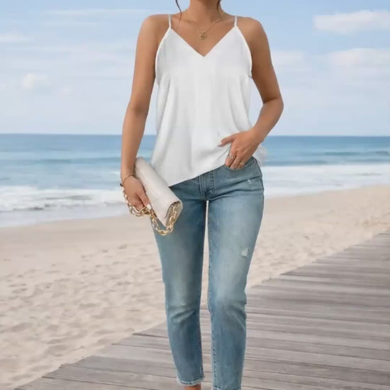 Designed with a feminine V-neckline, adjustable spaghetti straps, and a modern racerback, this tank delivers a relaxed yet polished silhouette. The loose fit skims the body without clinging, making it a go-to choice for staying cool while still looking put-together. Whether styled solo or layered under a jacket or cardigan, it brings understated confidence to any outfit.